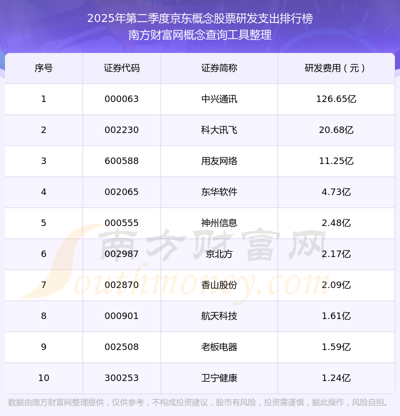 2025年第二季度,京東概念概念股票研發(fā)支出排行榜中,中興通訊(000063)研發(fā)支出總額高達126.65億,科大訊飛(002230)和用友網(wǎng)絡(600588)位居第二和第三,東華軟件(002065)、神州信息(000555)、京北方(002987)、香山股份(002870)、航天科技(000901)、老板電器(002508)、衛(wèi)寧健康(300253)進入前十,研發(fā)支出總額分別排名第4-10名。