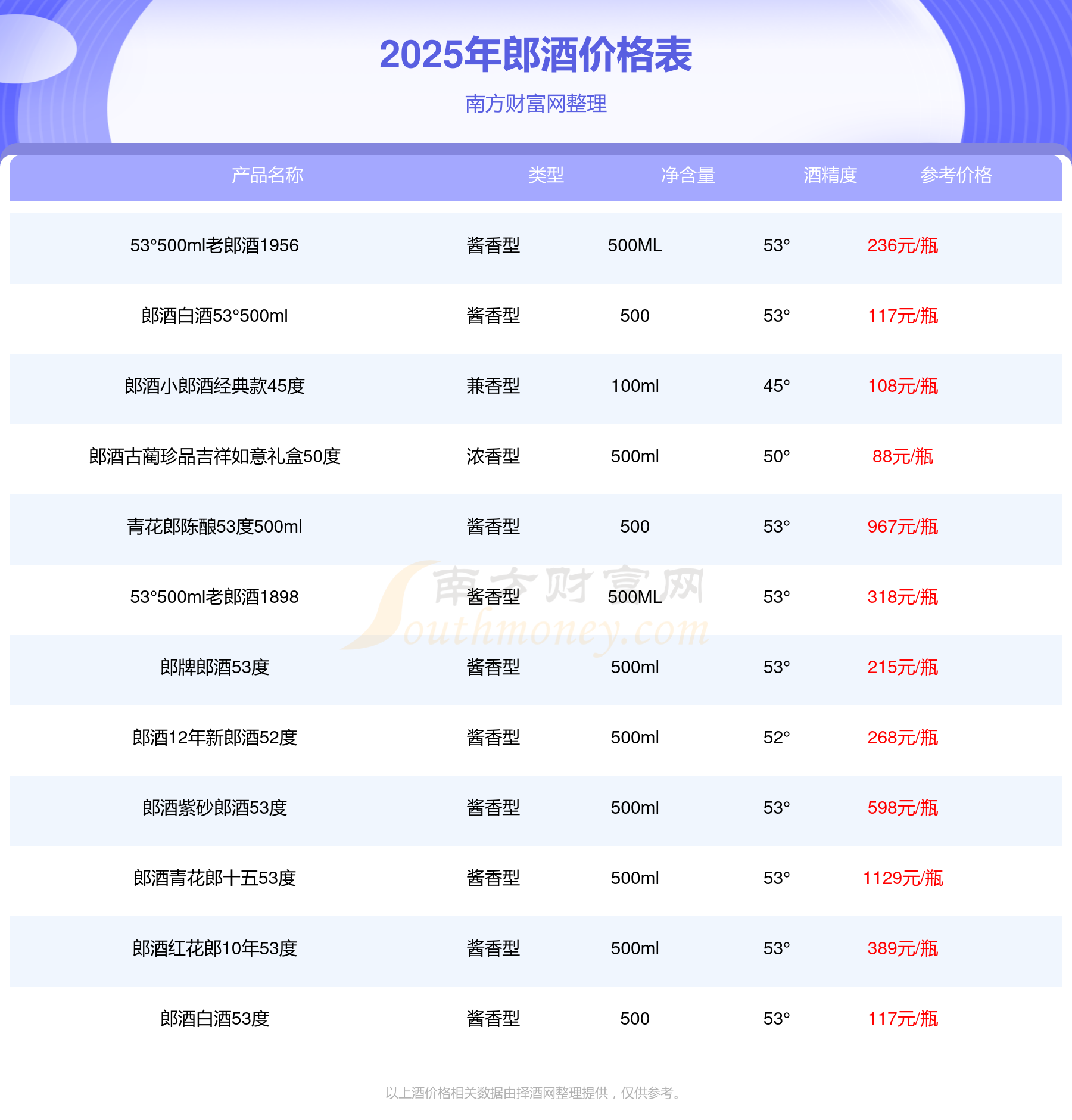 2025年,郎酒青花郎十五53度、青花郎陳釀53度500ml、郎酒紫砂郎酒53度、郎酒紅花郎10年53度、53°500ml老郎酒1898、郎酒12年新郎酒52度、53°500ml老郎酒1956、郎牌郎酒53度等郎酒價格如下:郎酒青花郎十五53度參考價1129元/瓶、青花郎陳釀53度500ml參考價967元/瓶、郎酒紫砂郎酒53度參考價598元/瓶、郎酒紅花郎10年53度參考價389元/瓶、53°500ml老郎酒1898參考價318元/瓶、郎酒12年新郎酒52度參考價268元/瓶、53°500ml老郎酒1956參考價236元/瓶、郎牌郎酒53度參考價215元/瓶。