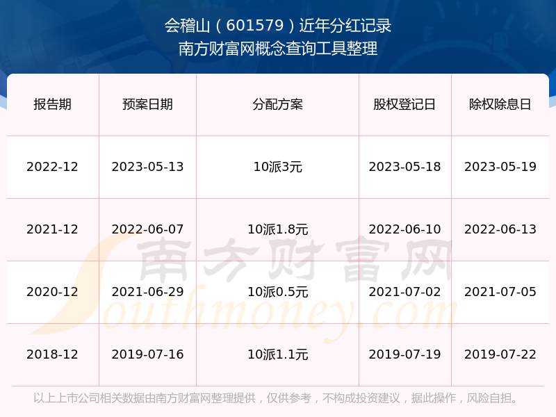 會稽山最新一次公布的分紅方案為10派3元。本次權(quán)益分派股權(quán)登記日為2023年5月18日,除權(quán)除息日為2023年5月19日,派息日為2023年5月19日。