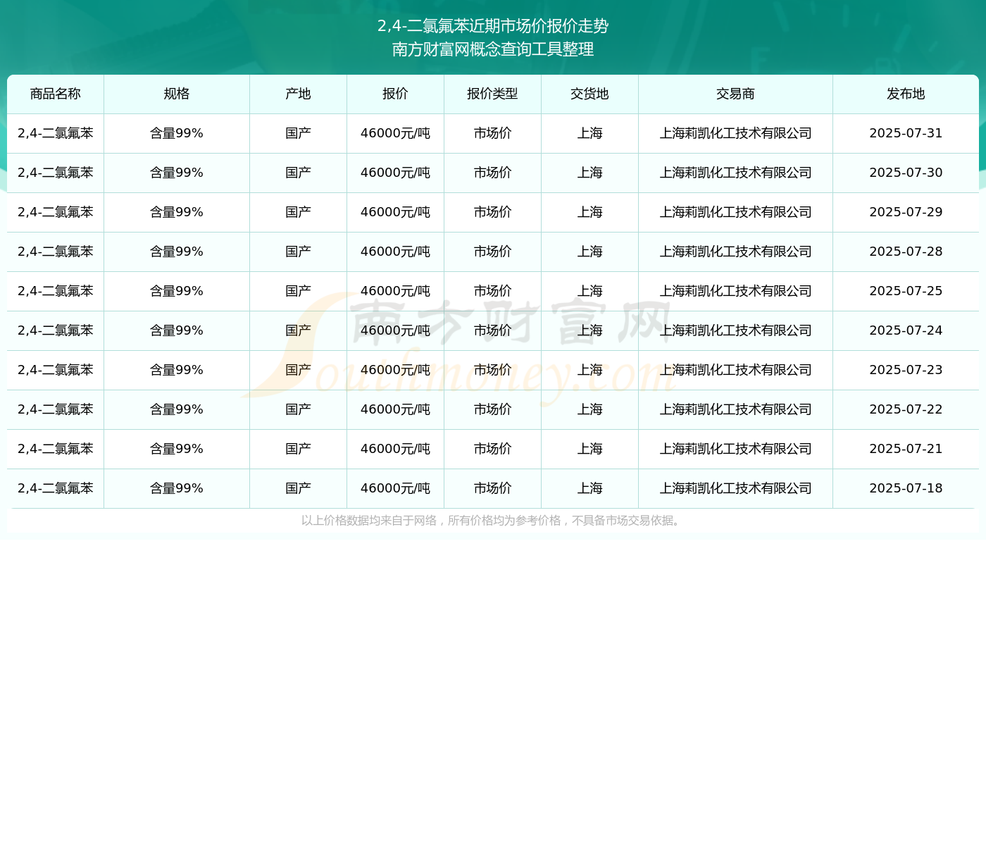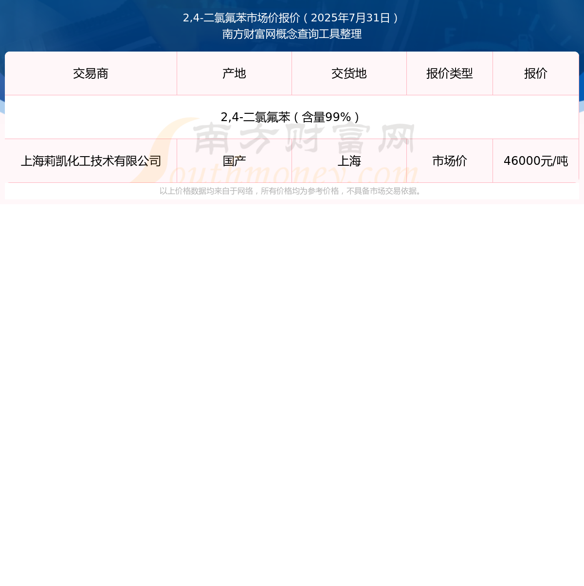 2025年7月31日,2,4-二氯氟苯(含量99%)市場(chǎng)價(jià)價(jià)格為46000.00元/噸,報(bào)價(jià)人:上海莉凱化工技術(shù)有限公司,交易地點(diǎn)為上海。
