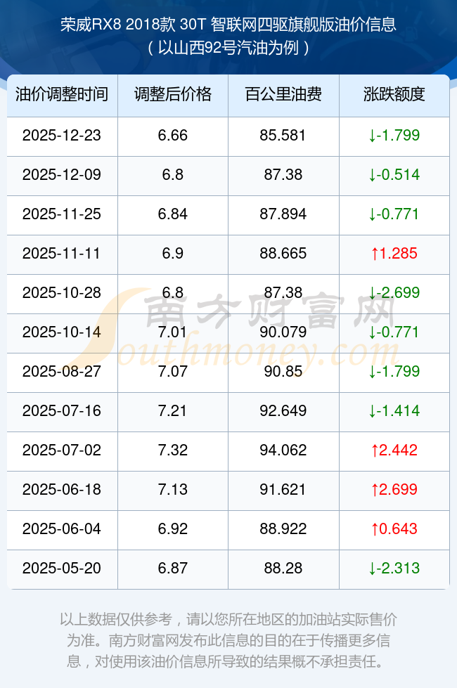 依照12月23日92號汽油最新調整價格6.66元/升來計算(以山西為例),該車型百公里的平均油費是85.581元,依照上一輪12月9日調整價格6.8元/升來計算,百公里的平均油費是87.38元,對比上一輪少花1.799元,下一輪的油價調整時間12月31日24時。