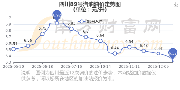 12月27日,四川89號(hào)汽油的價(jià)格是6.32元每升,本次的調(diào)整時(shí)間為12月23日,對(duì)比上次的調(diào)整跌了0.12元,跌1.863%,12月31日24時(shí)為下一輪油價(jià)調(diào)整時(shí)間,還有0天。