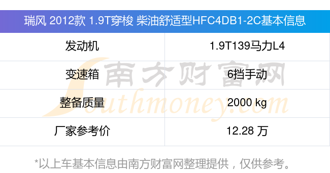 瑞風(fēng) 2012款 1.9T穿梭 柴油舒適型HFC4DB1-2C搭載了一臺(tái)1.9T139馬力L4渦輪增壓發(fā)動(dòng)機(jī),采用6擋手動(dòng)擋變速箱,常規(guī)整備質(zhì)量2000kg,廠家參考價(jià)12.28萬(wàn)元。