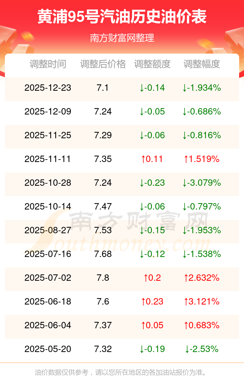 12月27日黃浦95號汽油的價格是12月23日調整后的價格,具體為7.1元/升,對比上次調整時間12月9日的油價7.24元每升,下調了0.14元,下調幅達1.934%。下一輪油價調整時間12月31日24時,距離現(xiàn)在還有0天。