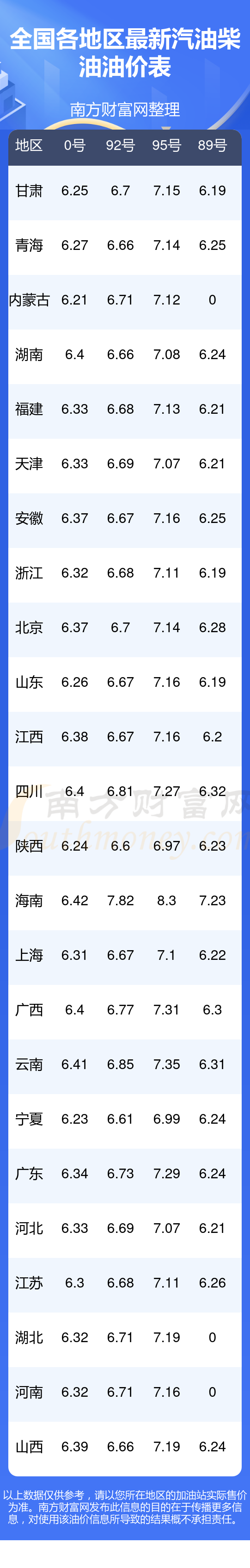 以上數(shù)據僅供參考,請以您所在地區(qū)的加油站實際售價為準。南方財富網發(fā)布此信息的目的在于傳播更多信息,對使用該油價信息所導致的結果概不承擔責任。