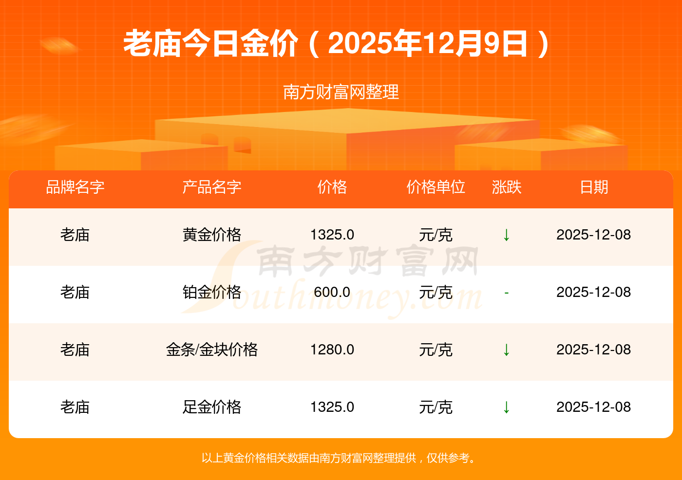 2025年12月9日老廟今日價格:金飾價格(內地)1328.0元/克,黃金飾品(香港)46610.0,鉑金飾品(香港)13990.0,金條金價(香港)42080.0,投資金條1303.0元/克,工藝金條1318.0元/克,千足金首飾1308.0元/克,投資銀條13.0元/克,黃金回購941.0元/克,白銀回購12.0元/克,千足金飾品1274.0元/克。
