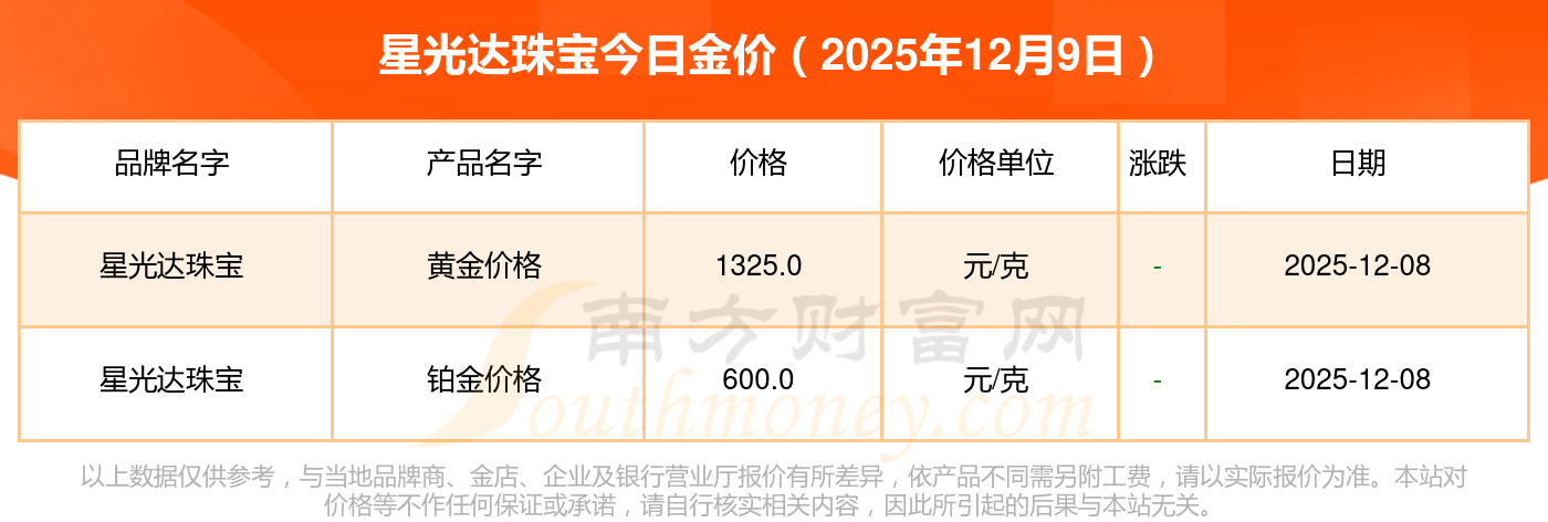 2025年12月9日星光達(dá)珠寶今日價(jià)格:金飾價(jià)格(內(nèi)地)1328.0元/克,黃金飾品(香港)46610.0,鉑金飾品(香港)13990.0,金條金價(jià)(香港)42080.0,投資金條1303.0元/克,工藝金條1318.0元/克,千足金首飾1308.0元/克,投資銀條13.0元/克,黃金回購941.0元/克,白銀回購12.0元/克,千足金飾品1274.0元/克。