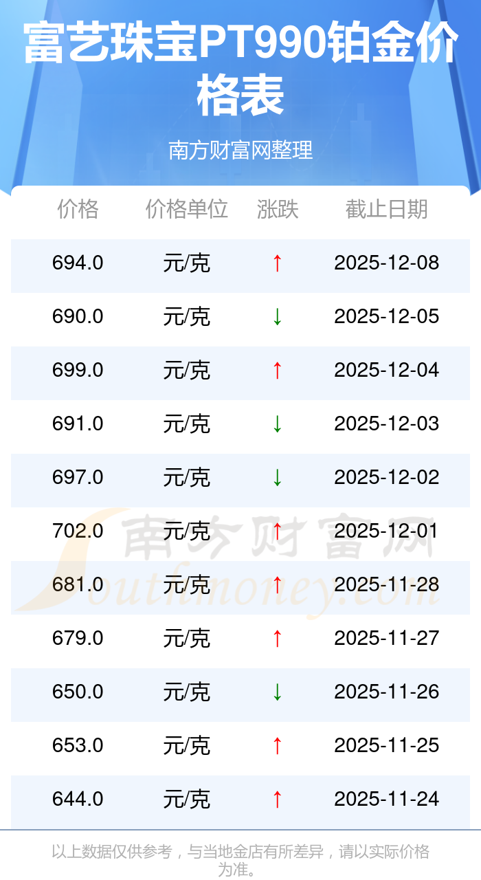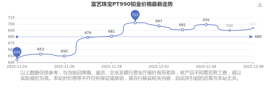 今日(2025年12月9日),富藝珠寶PT990鉑金最新價格為694.0元/克。