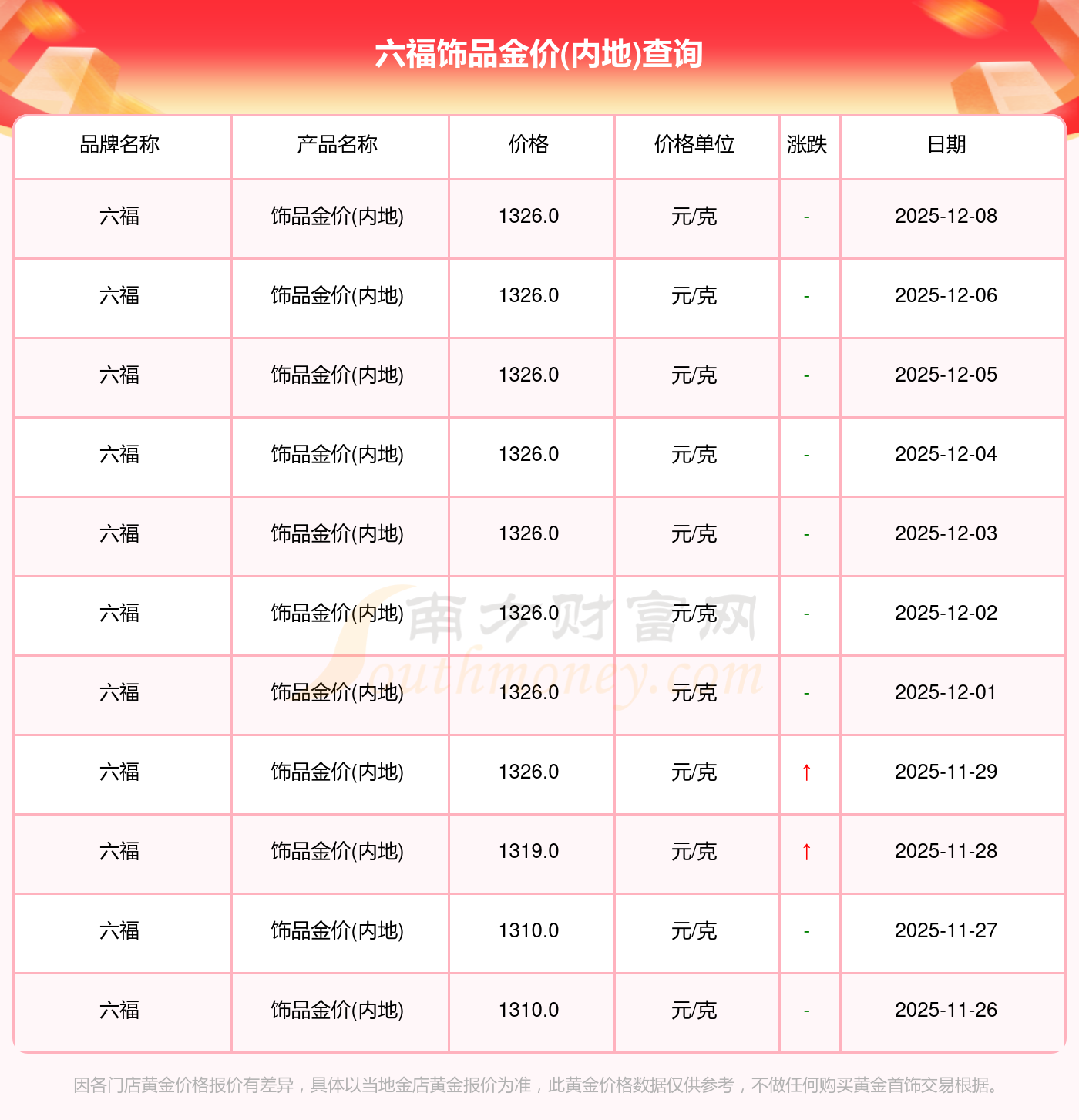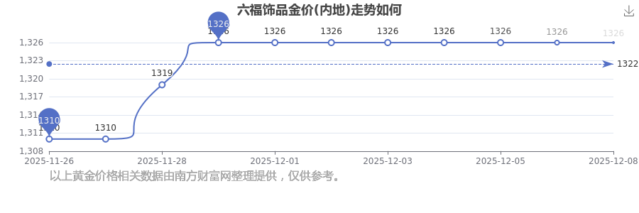 六福 飾品金價(內地)今日最新的價位是1326.0元/克。