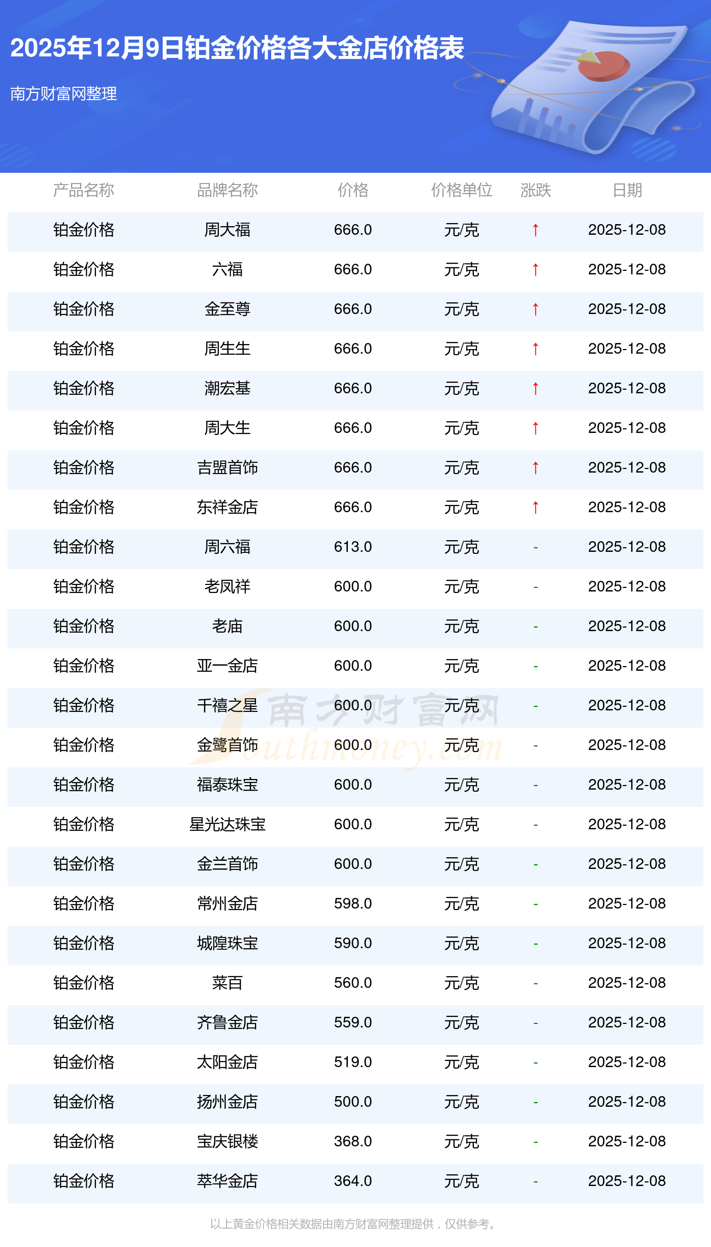 2025年12月9日各大金店鉑金價(jià)格多少錢1克,各大金店鉑金價(jià)格最新來了,一起來看看吧!