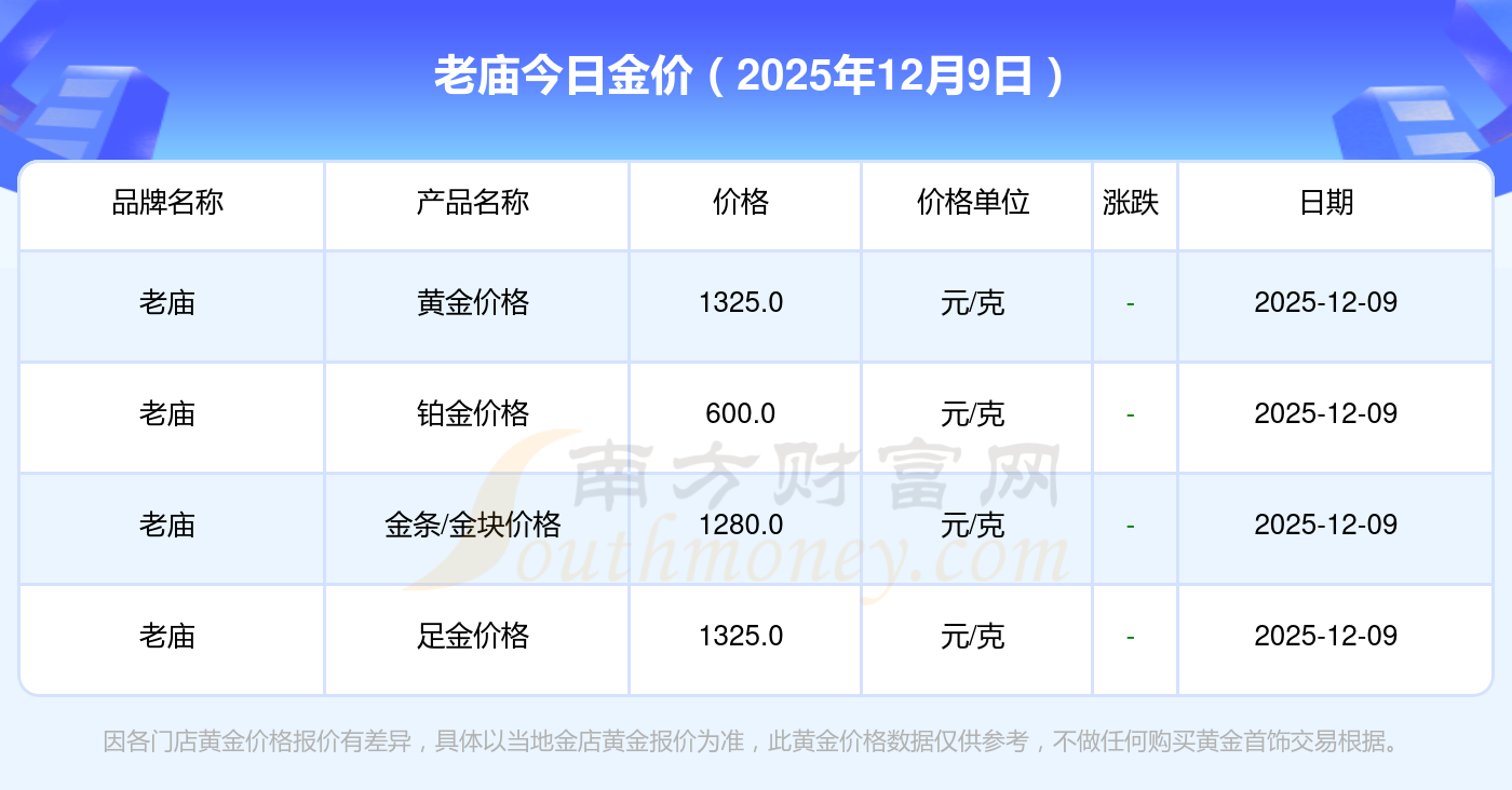 2025年12月9日老廟今日價(jià)格:黃金價(jià)格1328.0元/克,鉑金價(jià)格669.0元/克,飾品金價(jià)(內(nèi)地)1328.0元/克,黃金飾品(香港)46520.0,鉑金價(jià)格(香港)19190.0,金條價(jià)格(香港)41960.0,金條金價(jià)(內(nèi)地)1165.0元/克,黃金價(jià)格1289.0元/克,鉑金價(jià)格613.0元/克,PT999鉑金價(jià)格613.0元/克,金條價(jià)格1184.0元/克。