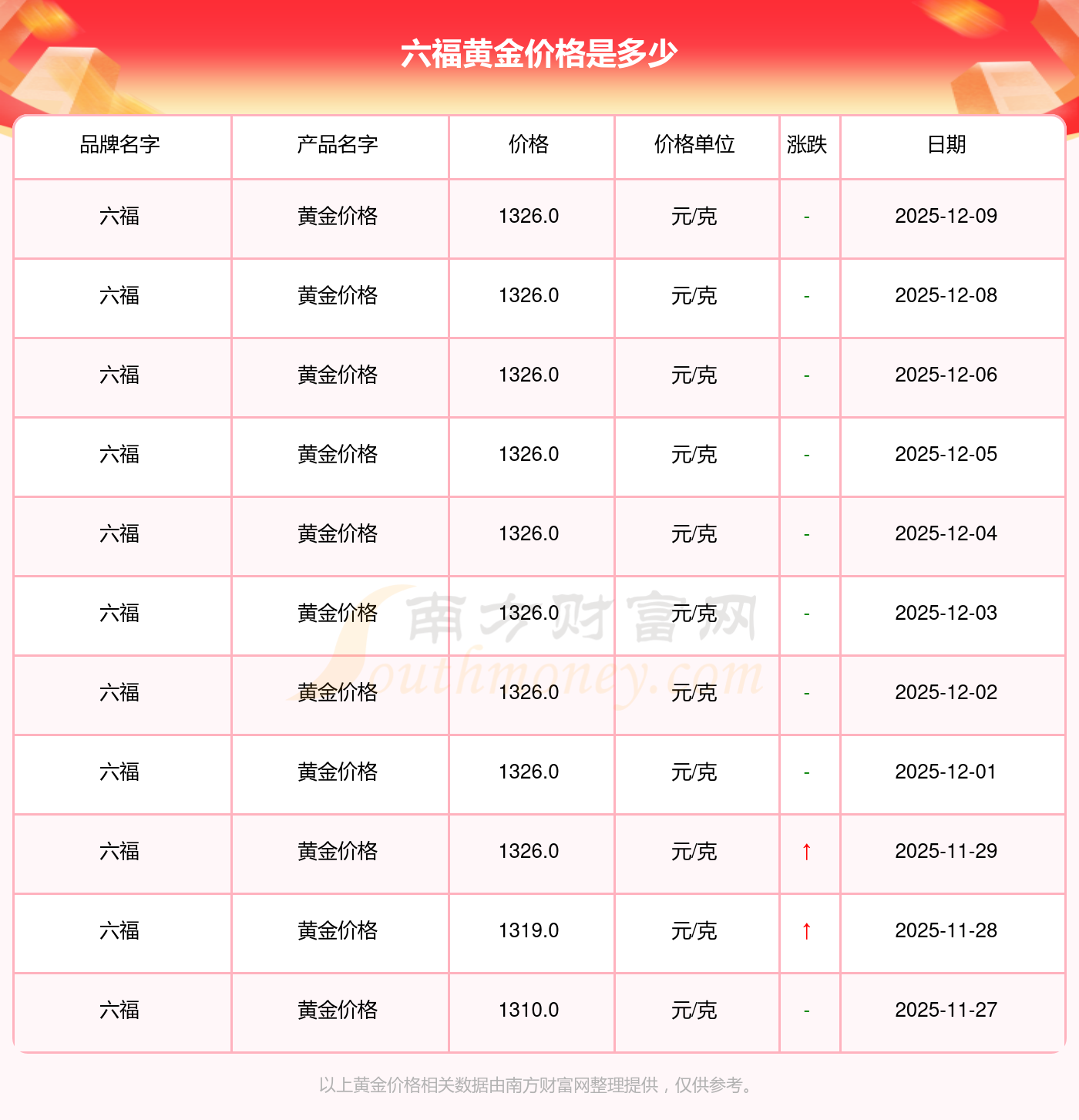 六福今日黃金價(jià)格的最新標(biāo)價(jià)為1326.0元/克。