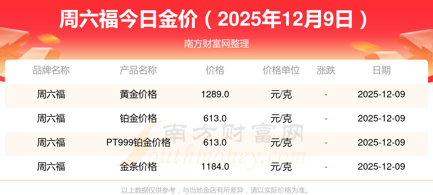 2025年12月9日周六福今日價格:黃金價格1328.0元/克,鉑金價格669.0元/克,飾品金價(內(nèi)地)1328.0元/克,黃金飾品(香港)46520.0,鉑金價格(香港)19190.0,金條價格(香港)41960.0,金條金價(內(nèi)地)1165.0元/克,黃金價格1289.0元/克,鉑金價格613.0元/克,PT999鉑金價格613.0元/克,金條價格1184.0元/克。