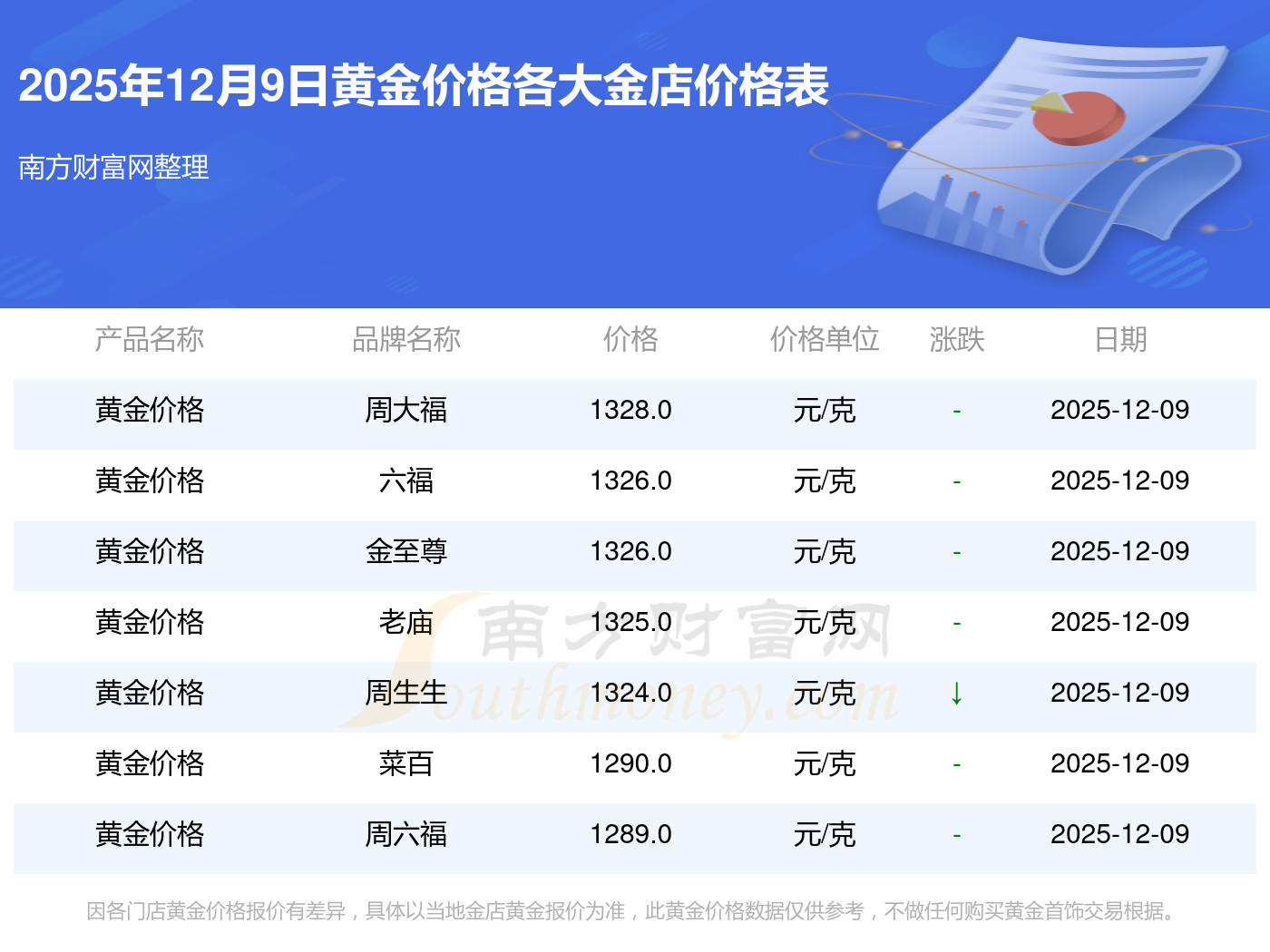 2025年12月9日周大福、周大福、周大福、周大福、周大福、周大福、周大福、周六福、周六福、周六福、周六福等各大金店品牌黃金價格最新價格如下:周大福黃金價格1328.0元/克,周大福鉑金價格669.0元/克,周大福飾品金價(內(nèi)地)1328.0元/克,周大福黃金飾品(香港)46520.0,周大福鉑金價格(香港)19190.0,周大福金條價格(香港)41960.0,周大福金條金價(內(nèi)地)1165.0元/克,周六福黃金價格1289.0元/克,周六福鉑金價格613.0元/克,周六福PT999鉑金價格613.0元/克,周六福金條價格1184.0元/克。