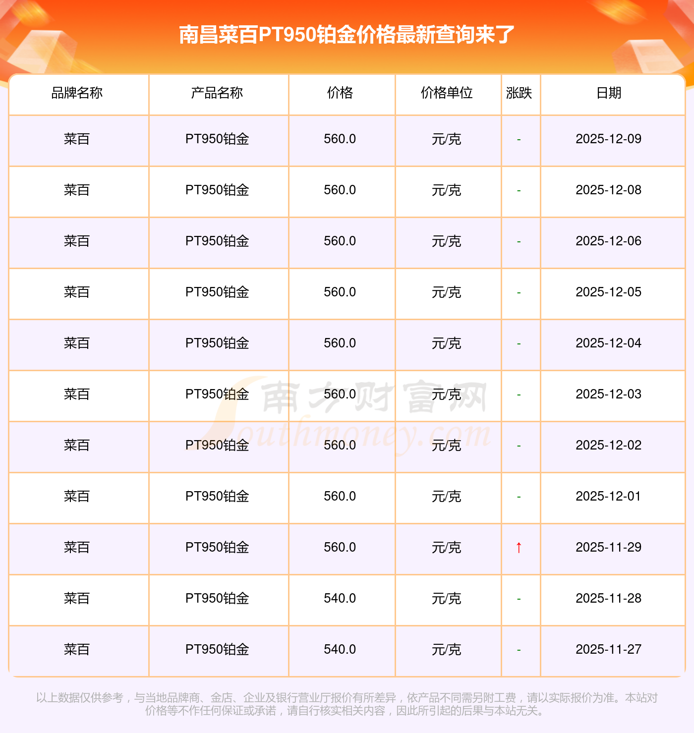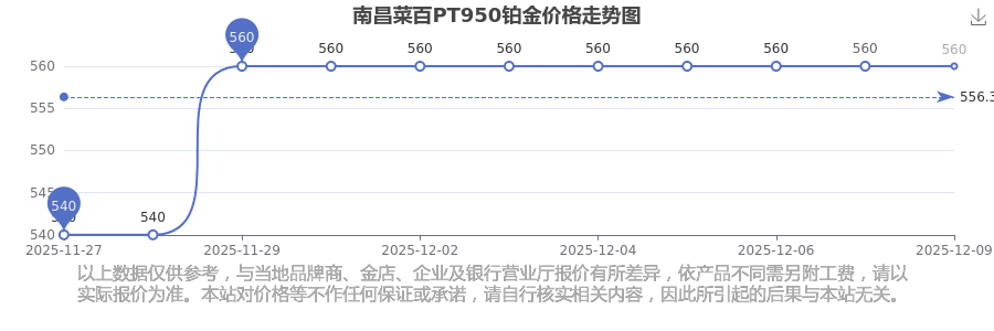 (2025年12月9日)今日南昌菜百PT950鉑金價(jià)格是560.0元/克。