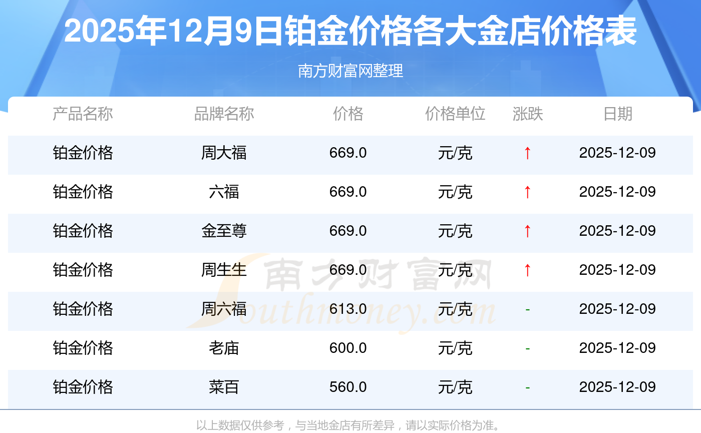2025年12月9日,周大福、周大福、周大福、周大福、周大福、周大福、周大福、周六福、周六福、周六福、周六福等各大金店品牌鉑金價(jià)格今日價(jià)格如下:周大福1328.0元/克、周大福669.0元/克、周大福1328.0元/克、周大福46520.0、周大福19190.0、周大福41960.0、周大福1165.0元/克、周六福1289.0元/克、周六福613.0元/克、周六福613.0元/克、周六福1184.0元/克。