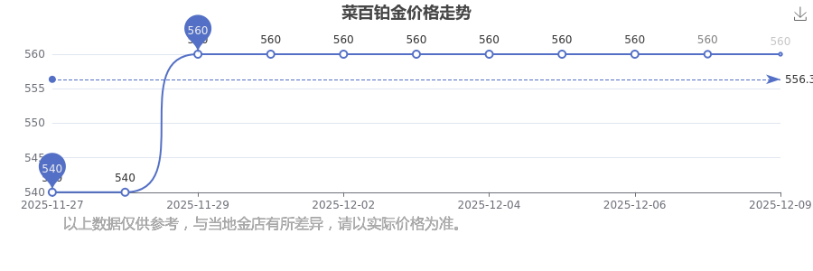 2025年12月9日菜百鉑金價(jià)格查詢:560.0元/克。