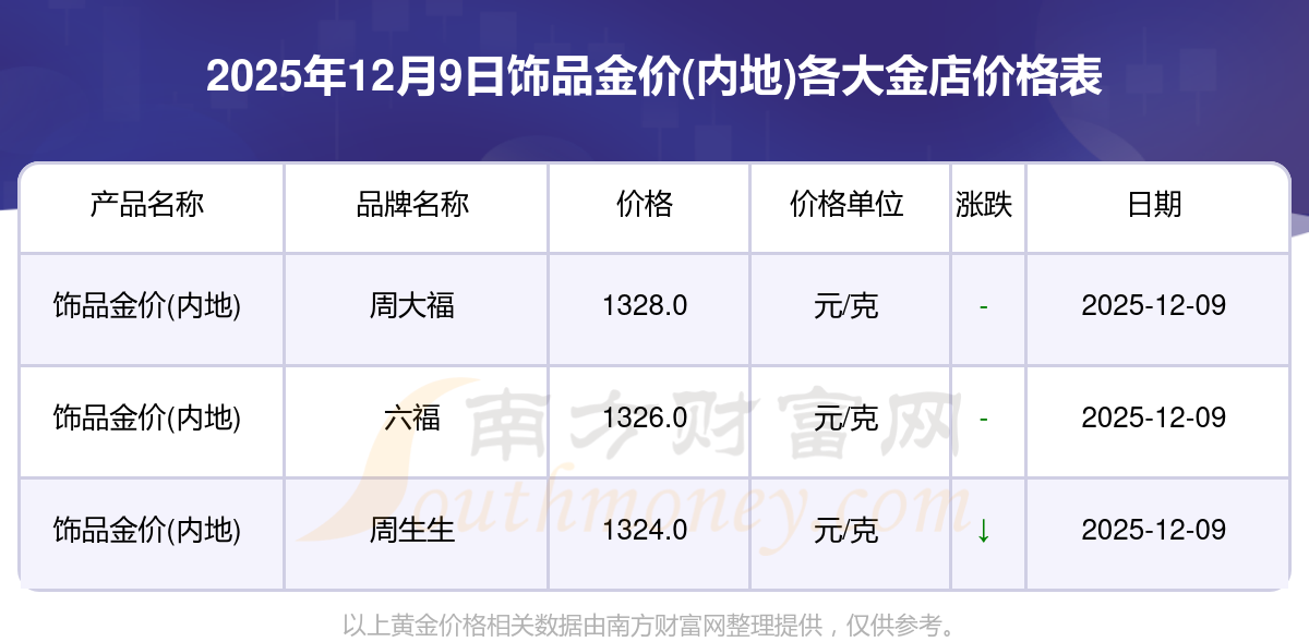 今天是2025年12月9日,周大福、周大福、周大福、周大福、周大福、周大福、周大福、周六福、周六福、周六福、周六福等各大金店品牌飾品金價(jià)(內(nèi)地)最新價(jià)格如下:周大福1328.0元/克、周大福669.0元/克、周大福1328.0元/克、周大福46520.0、周大福19190.0、周大福41960.0、周大福1165.0元/克、周六福1289.0元/克、周六福613.0元/克、周六福613.0元/克、周六福1184.0元/克。