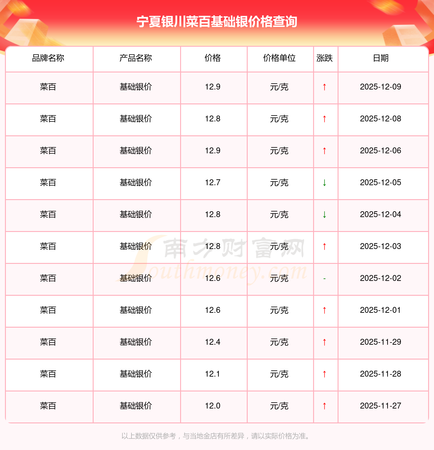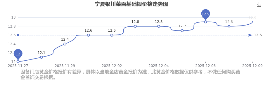 2025年12月9日寧夏銀川菜百基礎(chǔ)銀價(jià)格是12.9元/克。