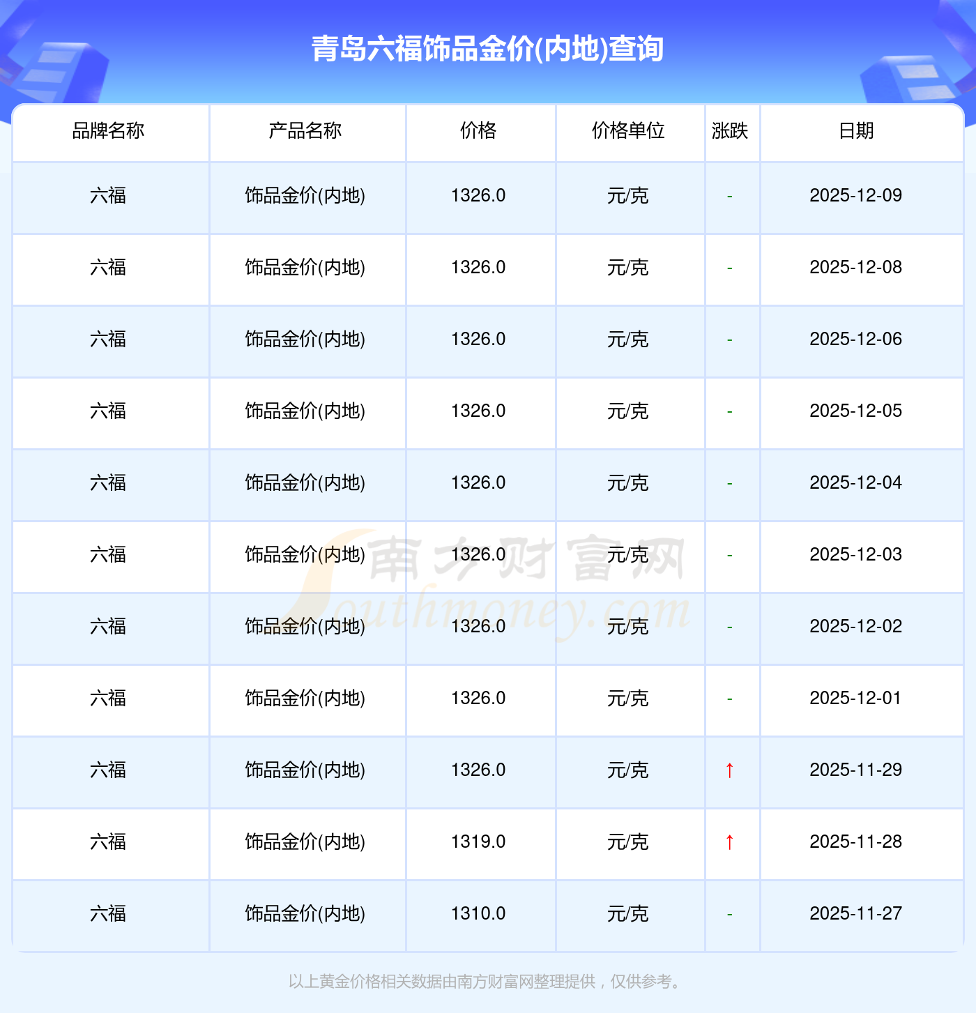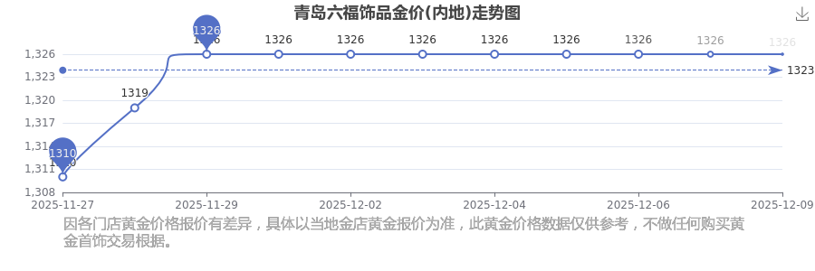 2025年12月9日當(dāng)天,青島六福飾品金價(jià)(內(nèi)地)的單價(jià)是 1326.0元/克。