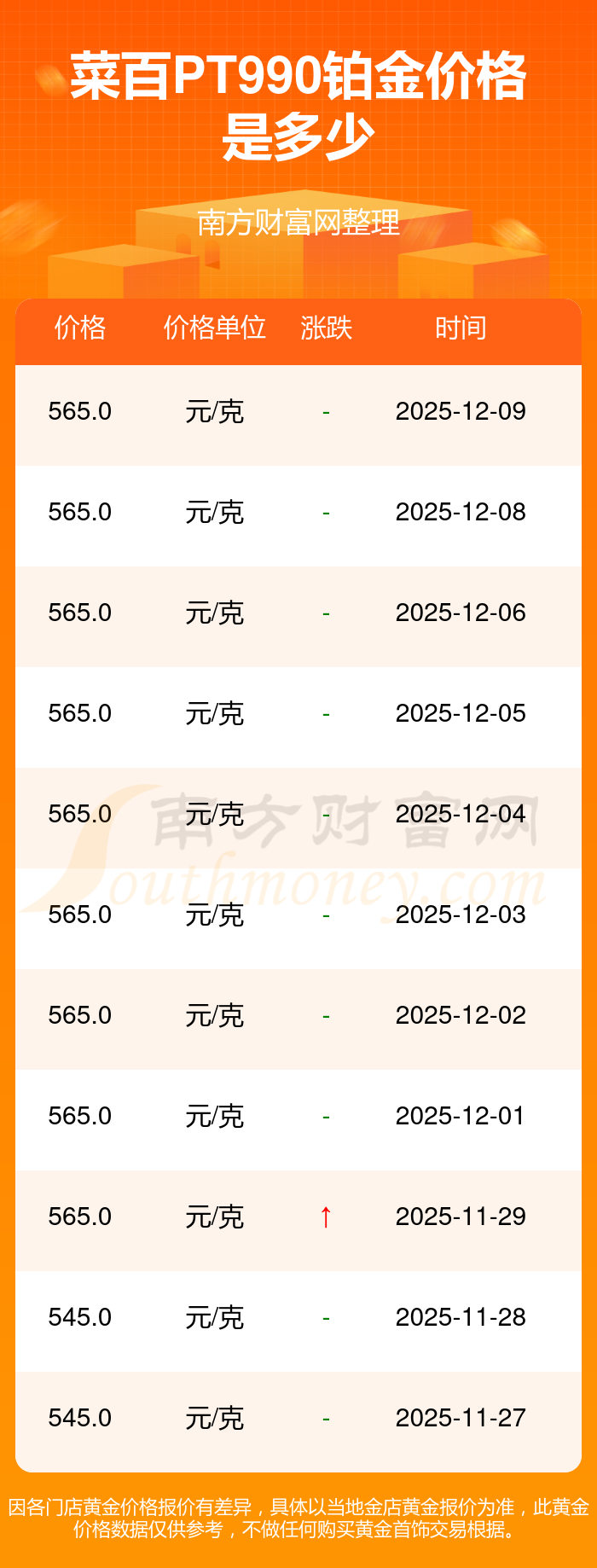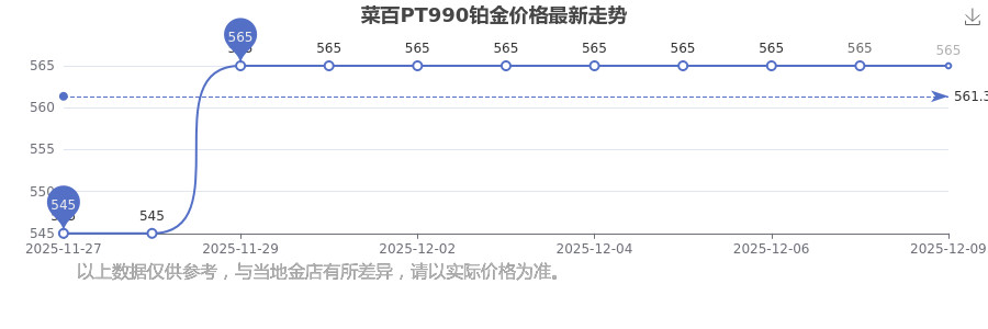 今日(2025年12月9日),菜百PT990鉑金最新價格是565.0元/克。