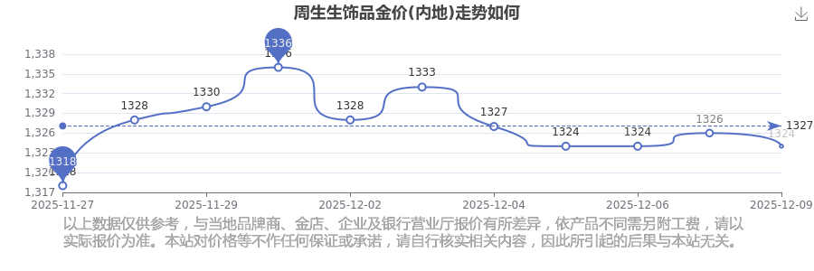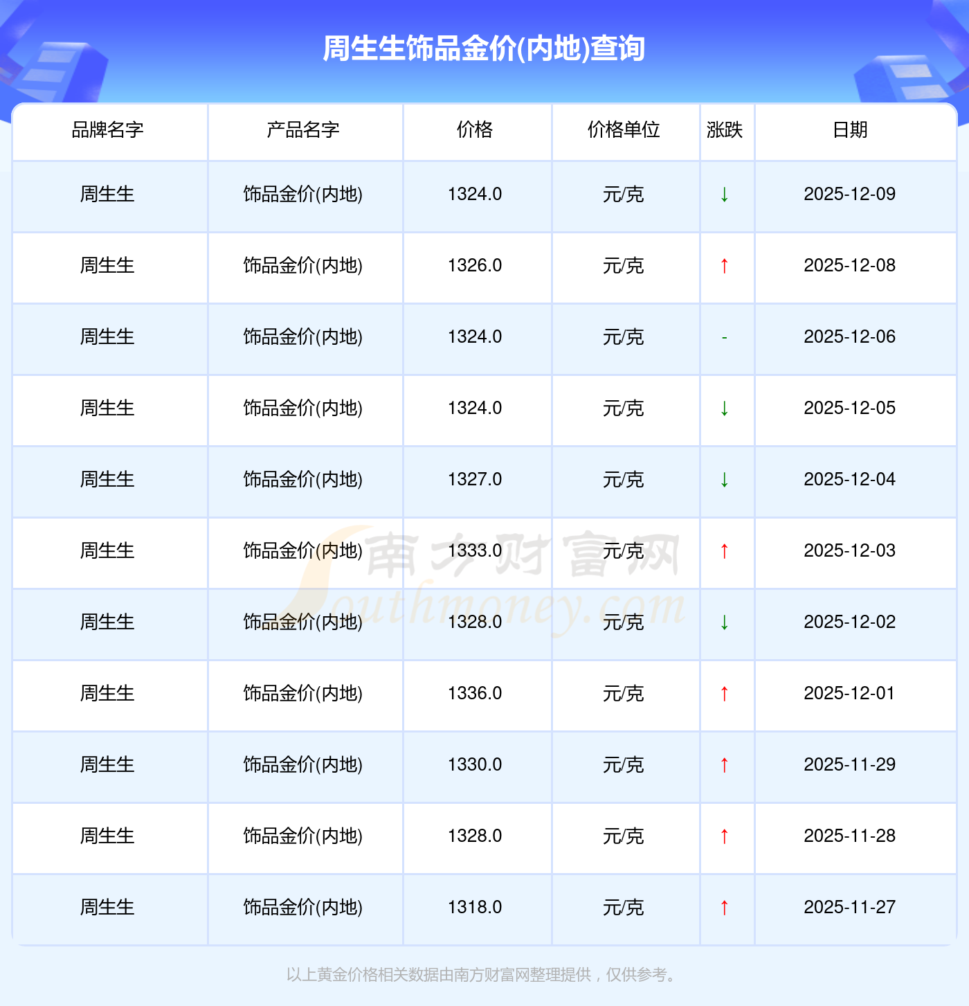 2025年12月9日周生生飾品金價(內地)查詢:1324.0元/克。
