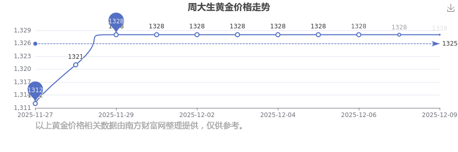 今日(2025年12月9日)周大生黃金價格為1328.0元/克。