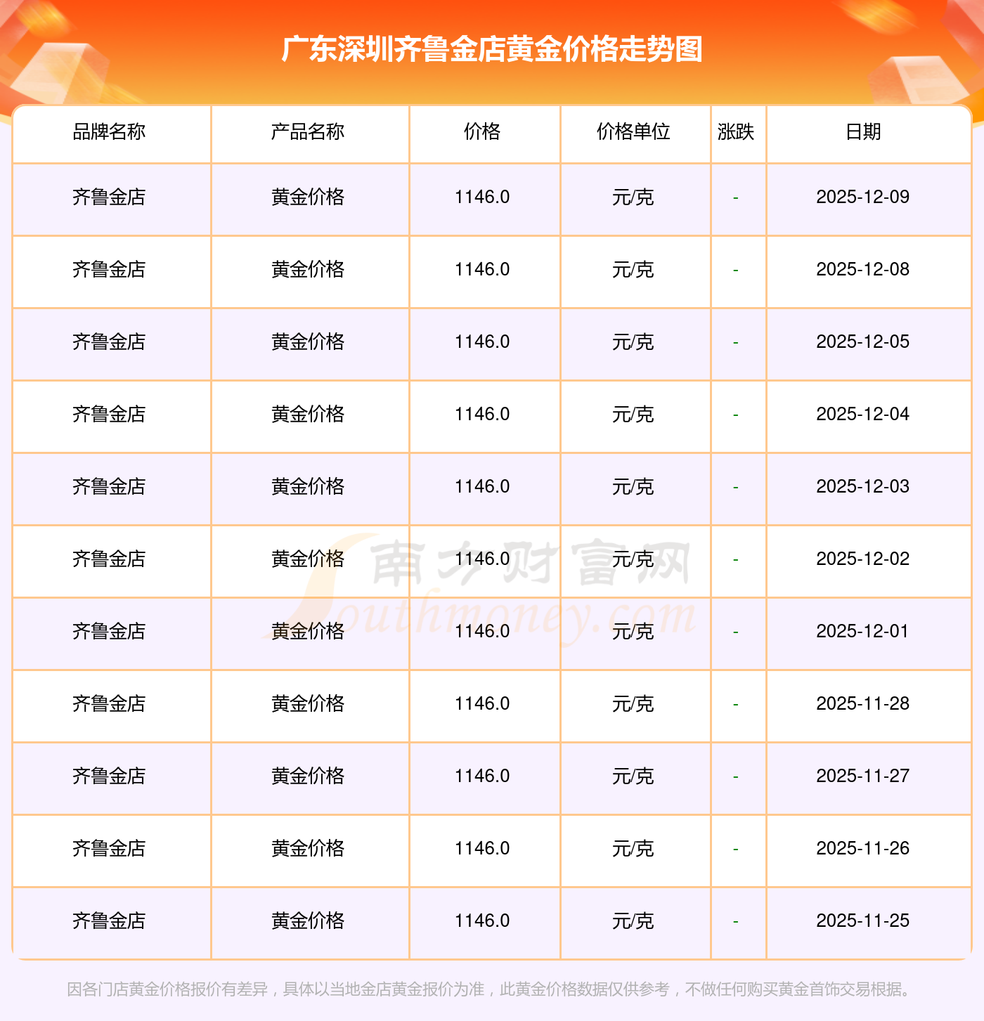 2025年12月9日這一天,廣東深圳齊魯金店的黃金價(jià)格以 1146.0元/克的價(jià)格售賣。