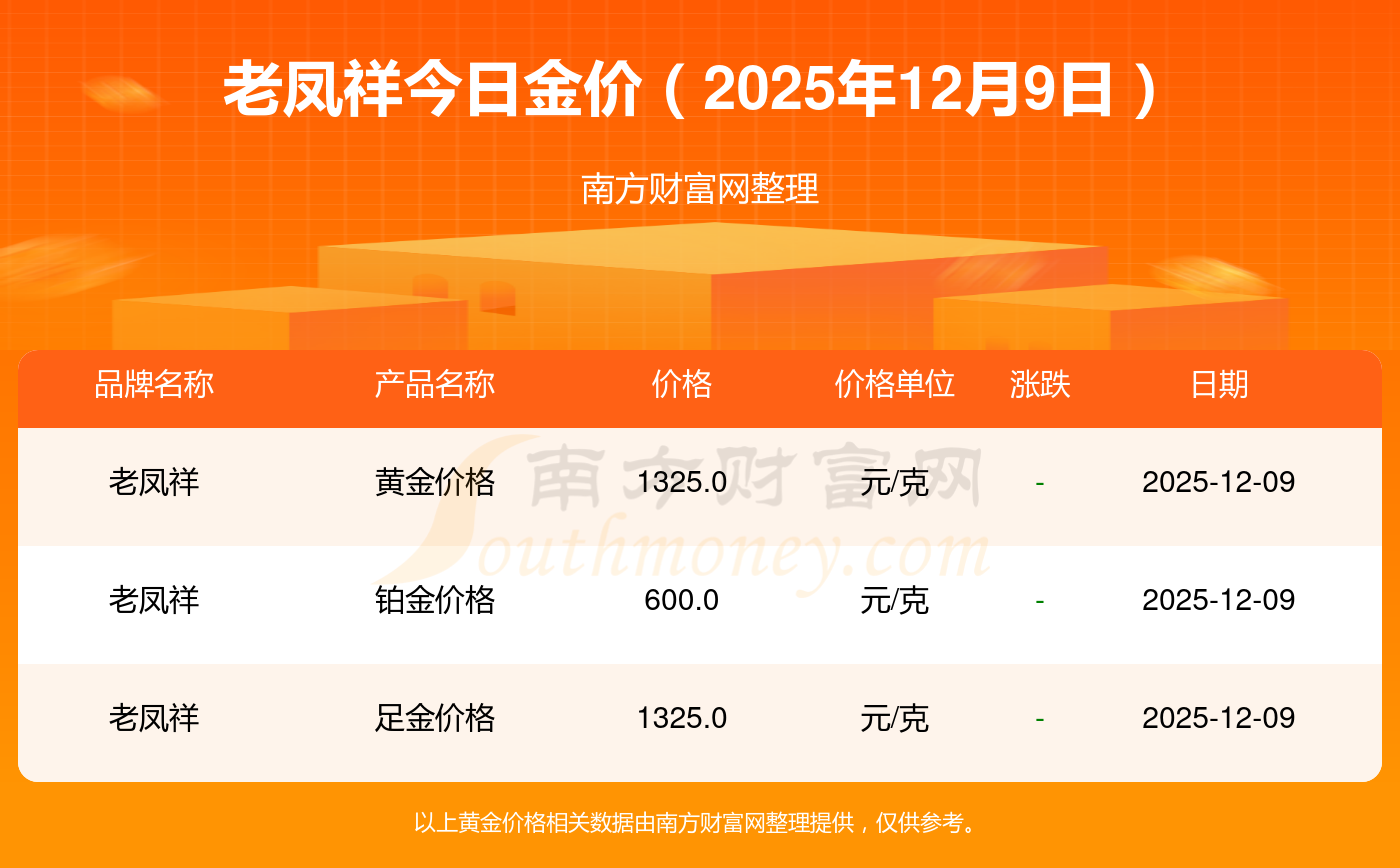 老鳳祥今日金價(jià)的具體數(shù)字是怎樣的?數(shù)據(jù)來了:黃金價(jià)格1328.0元/克,鉑金價(jià)格669.0元/克,飾品金價(jià)(內(nèi)地)1328.0元/克,黃金飾品(香港)46520.0,鉑金價(jià)格(香港)19190.0,金條價(jià)格(香港)41960.0,金條金價(jià)(內(nèi)地)1165.0元/克,黃金價(jià)格1289.0元/克,鉑金價(jià)格613.0元/克,PT999鉑金價(jià)格613.0元/克,金條價(jià)格1184.0元/克。
