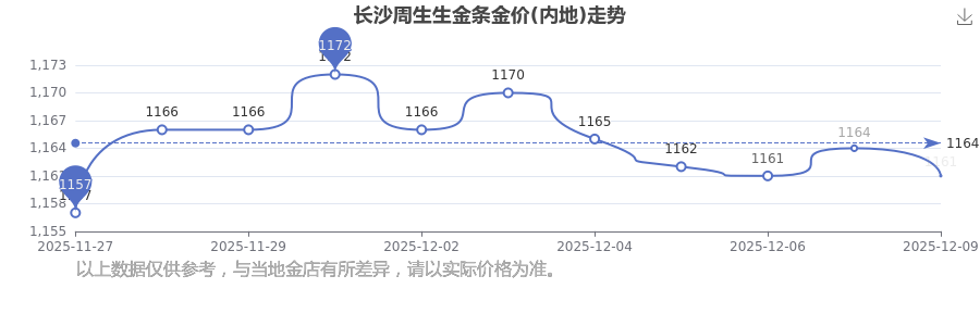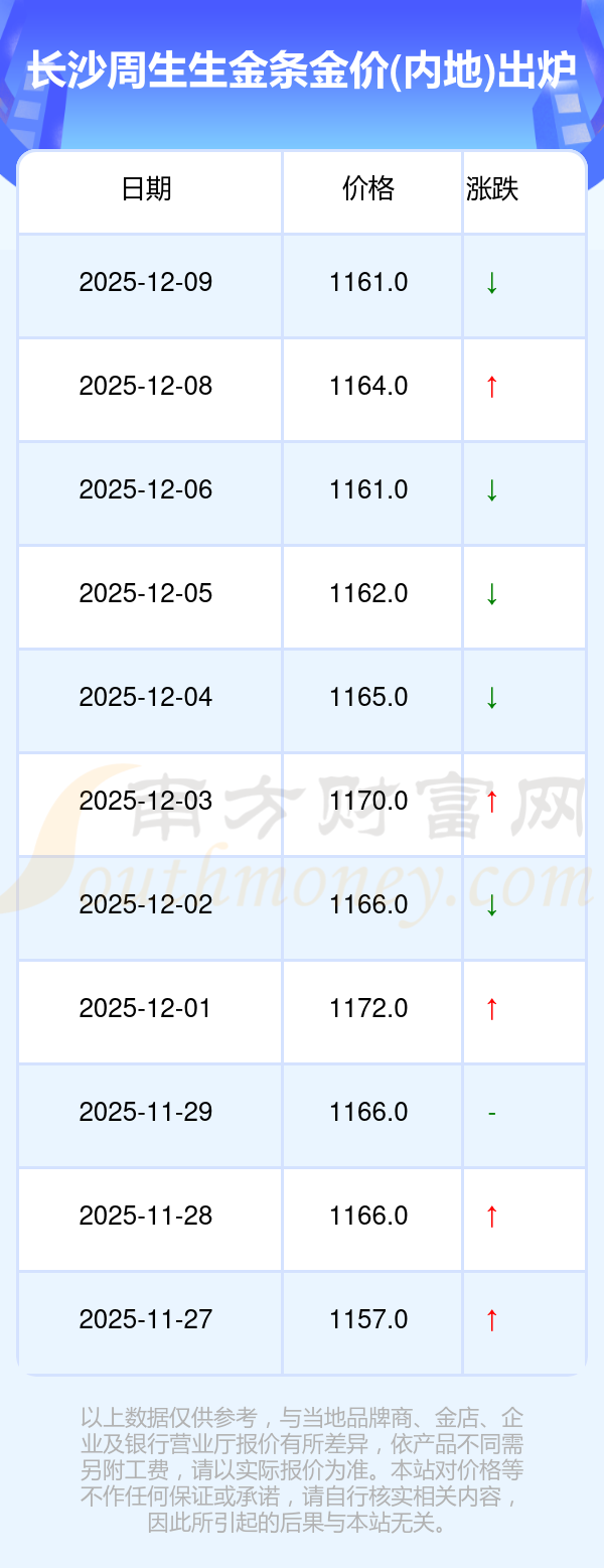 (2025年12月9日)今日長沙周生生金條金價(內(nèi)地)是1161.0元/克。