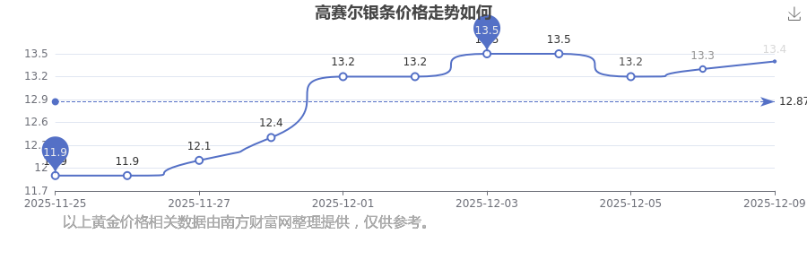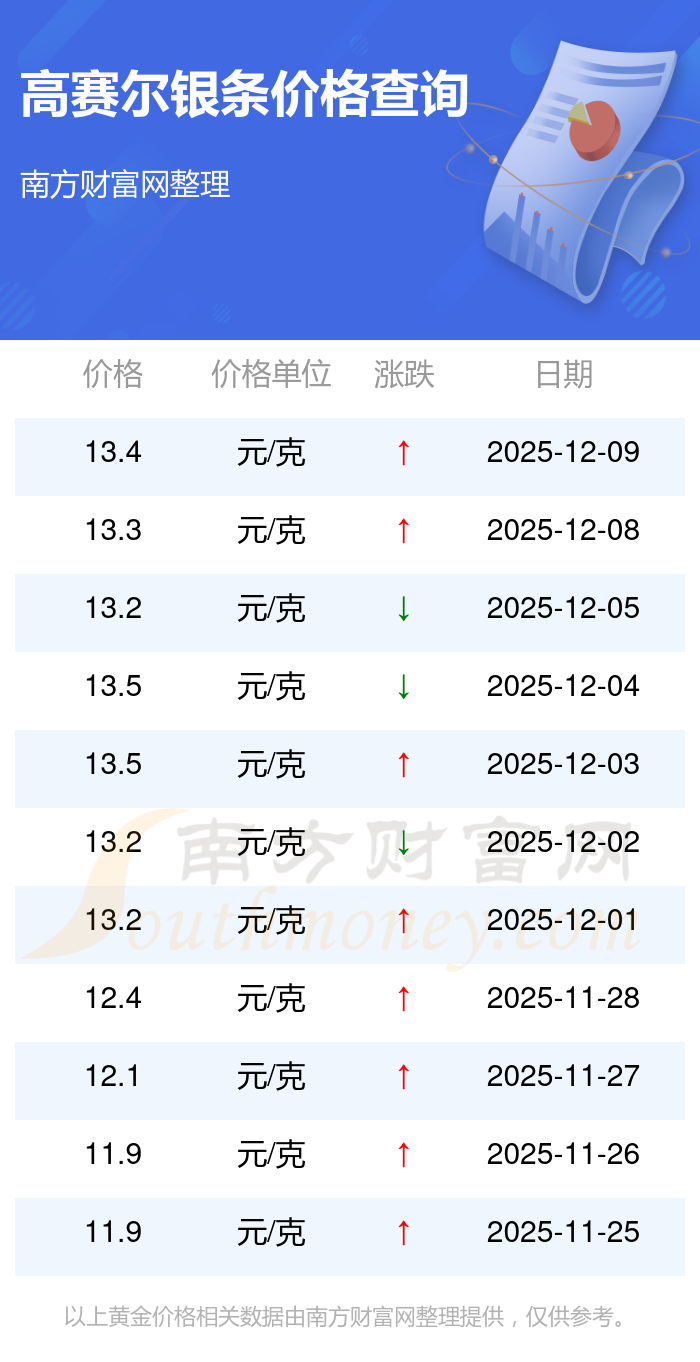 目前高賽爾 銀條的價格,今日最新為13.4元/克。