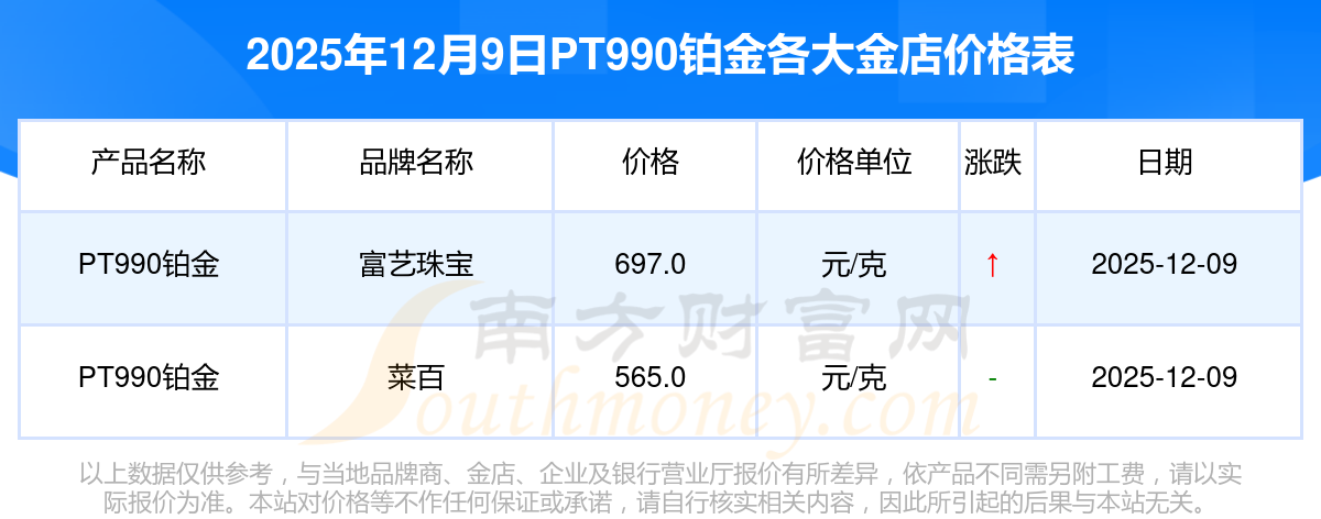 2025年12月9日,周大福、周大福、周大福、周大福、周大福、周大福、周大福、周六福、周六福、周六福、周六福等各大金店品牌PT990鉑金今日價格如下:周大福1328.0元/克、周大福669.0元/克、周大福1328.0元/克、周大福46520.0、周大福19190.0、周大福41960.0、周大福1165.0元/克、周六福1289.0元/克、周六福613.0元/克、周六福613.0元/克、周六福1184.0元/克。