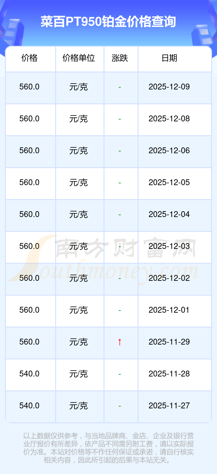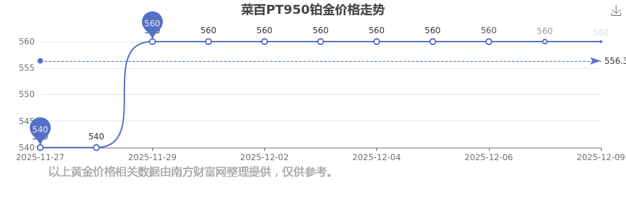 據(jù)了解,菜百今日PT950鉑金價(jià)格為560.0元/克。