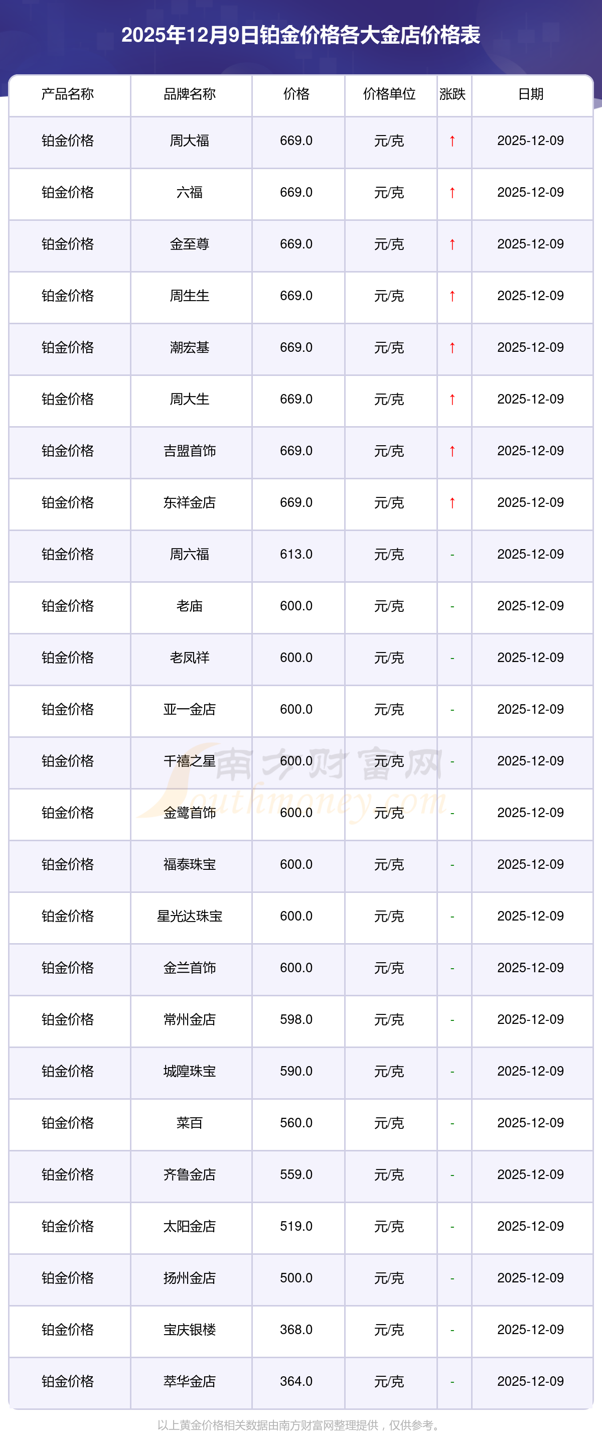 目前,鉑金價格報價區(qū)間在669.0元/克和364.0元/克之間。最高的為周大福,報價669.0元/克,最低的為萃華金店,報價364.0元/克。今日鉑金價格高低差為305元/克。