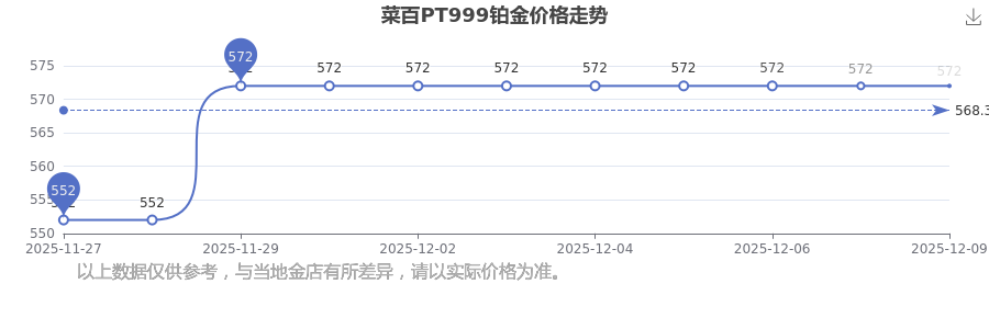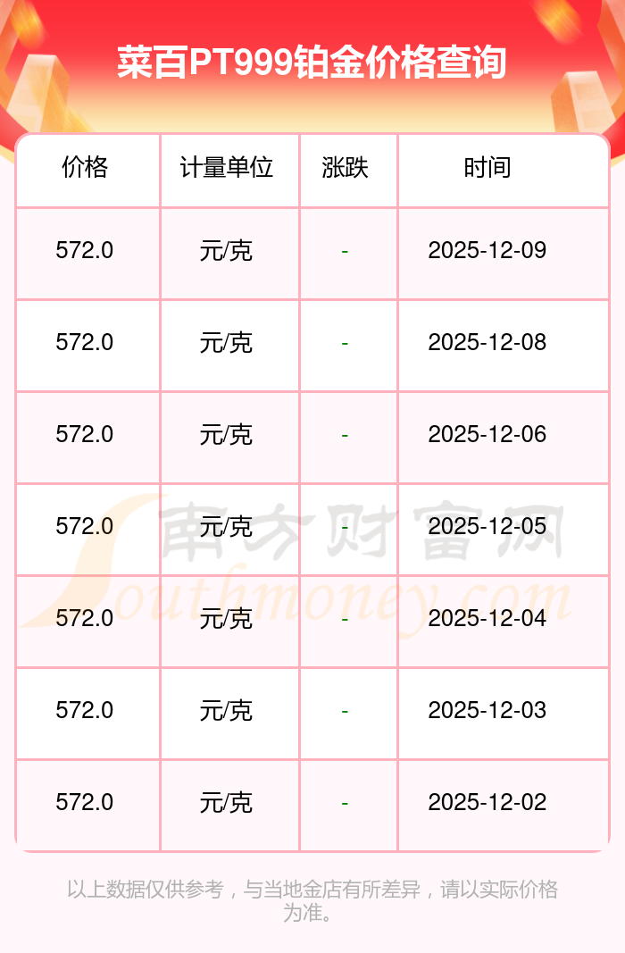 今日菜百 PT999鉑金價格,最新確定為572.0元/克。