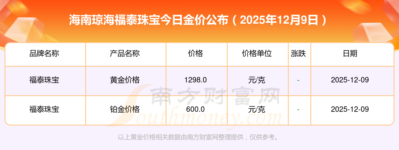 2025年12月9日海南瓊海福泰珠寶最新價(jià)格:黃金價(jià)格1328.0元/克,鉑金價(jià)格669.0元/克,飾品金價(jià)(內(nèi)地)1328.0元/克,黃金飾品(香港)46520.0,鉑金價(jià)格(香港)19190.0,金條價(jià)格(香港)41960.0,金條金價(jià)(內(nèi)地)1165.0元/克,黃金價(jià)格1289.0元/克,鉑金價(jià)格613.0元/克,PT999鉑金價(jià)格613.0元/克,金條價(jià)格1184.0元/克。