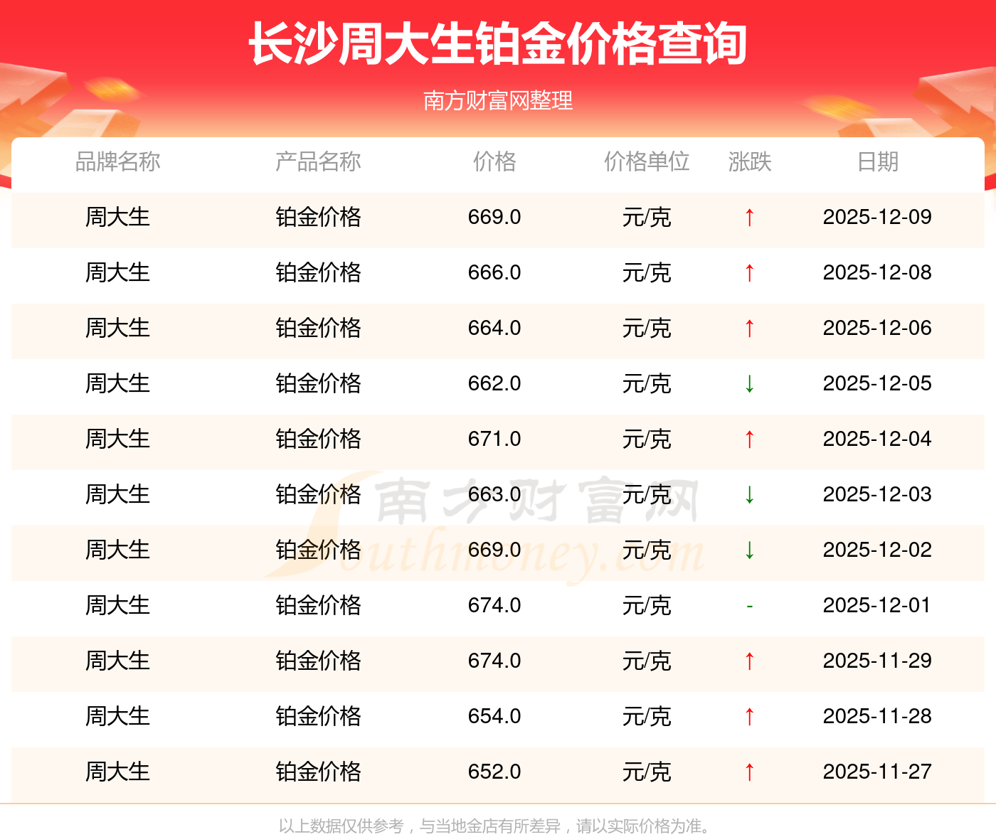 長沙周大生鉑金價格在 2025年12月9日,其市場價格為 669.0元/克。