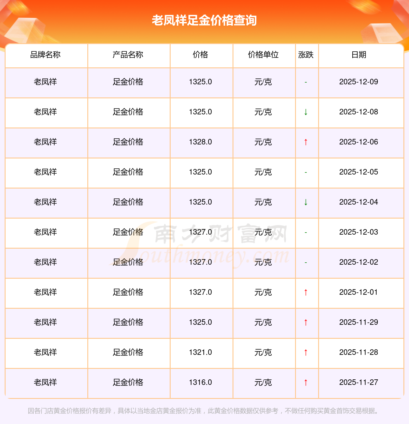 2025年12月9日老鳳祥足金價(jià)格最新是1325.0元/克。