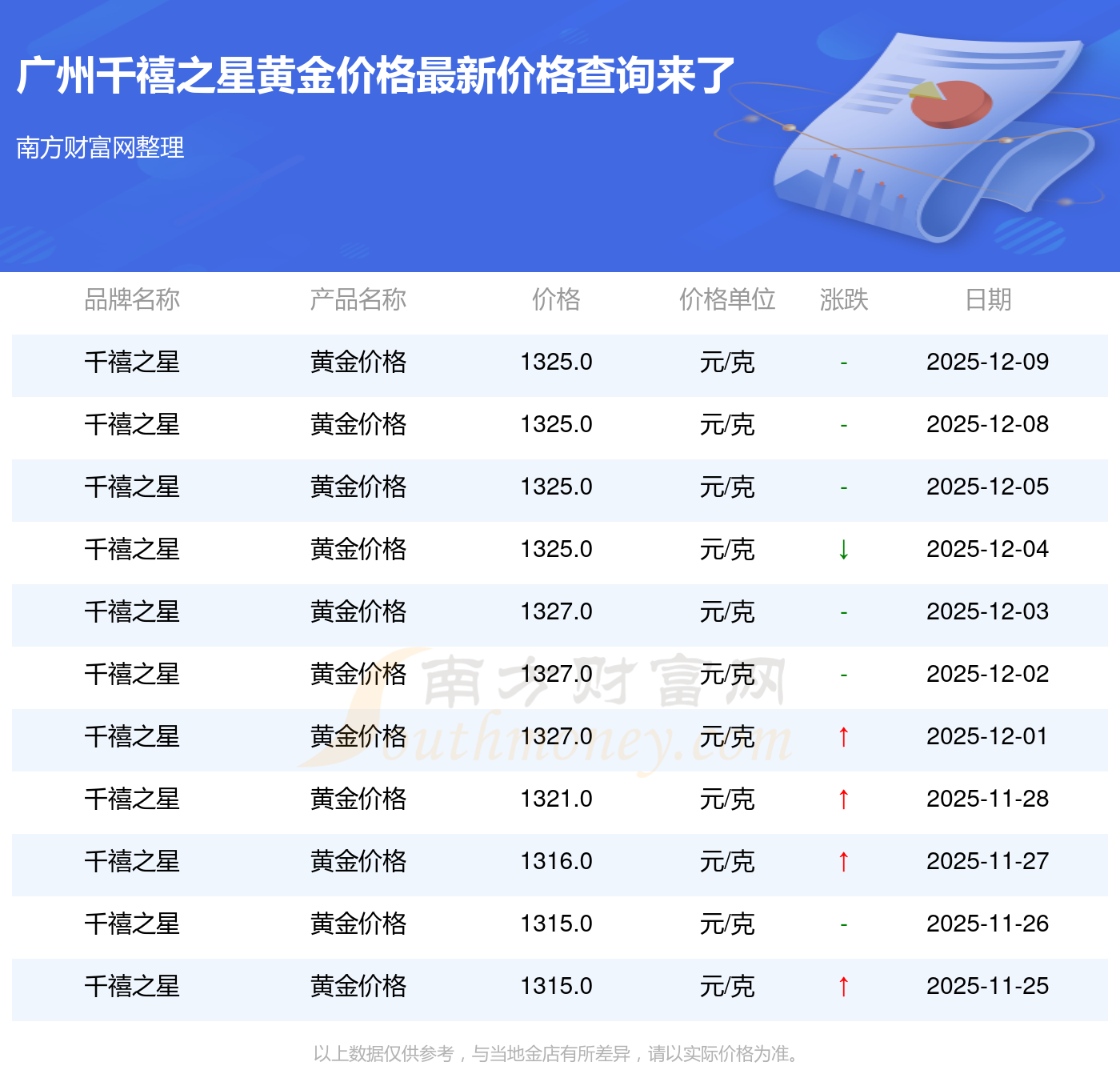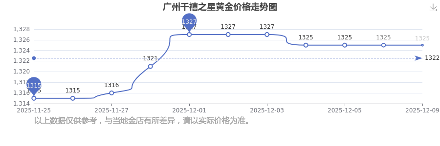 廣州千禧之星 2025年12月9日的黃金價(jià)格價(jià)位為 1325.0元/克。