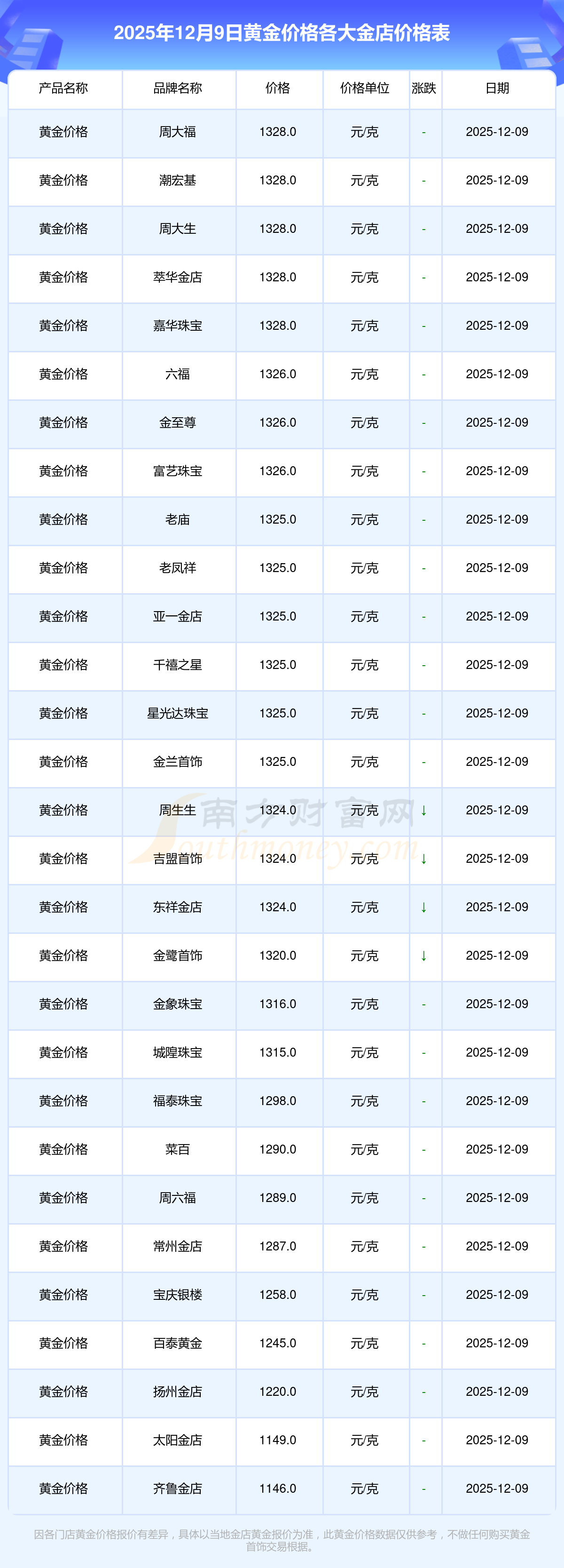 2025年12月9日各大金店黃金價格最新價格:周大福1328.0元/克,周大福669.0元/克,周大福1328.0元/克,周大福46520.0,周大福19190.0,周大福41960.0,周大福1165.0元/克,周六福1289.0元/克,周六福613.0元/克,周六福613.0元/克,周六福1184.0元/克。