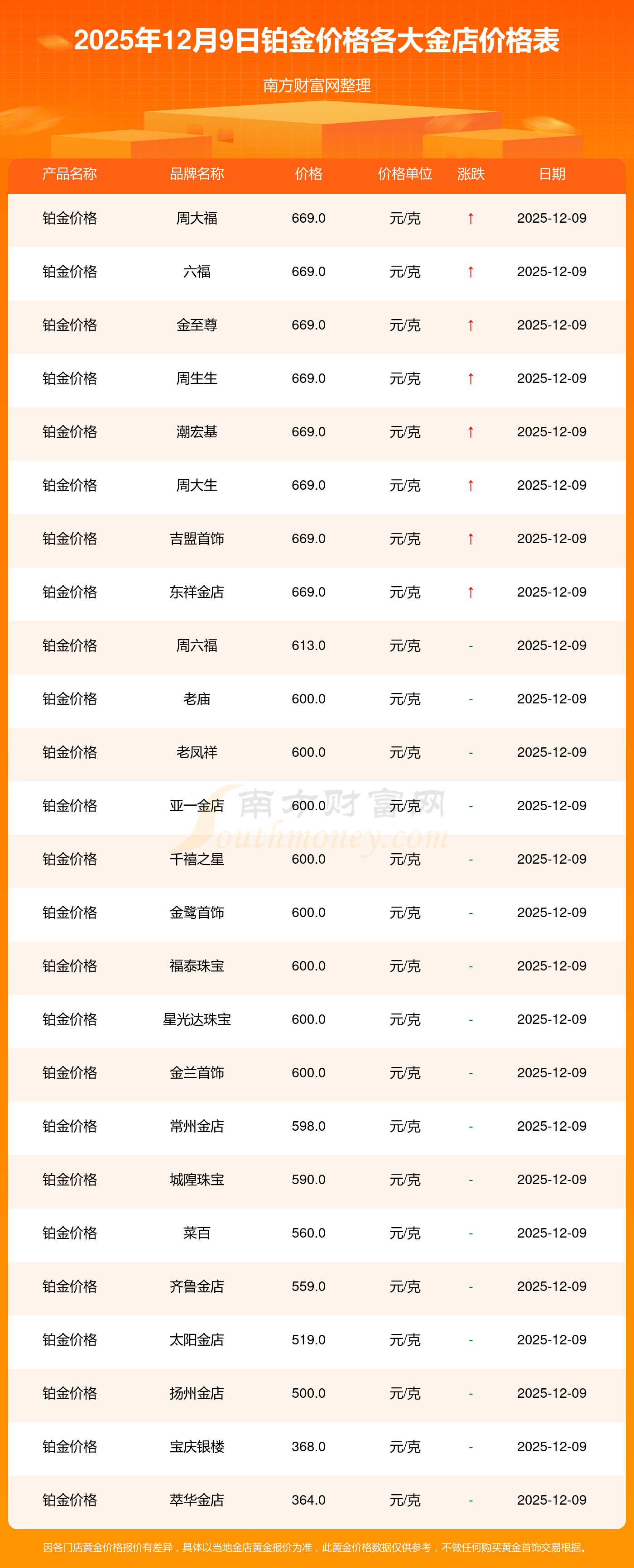 2025年12月9日各大金店鉑金價(jià)格多少1克?各大金店鉑金價(jià)格報(bào)價(jià)表