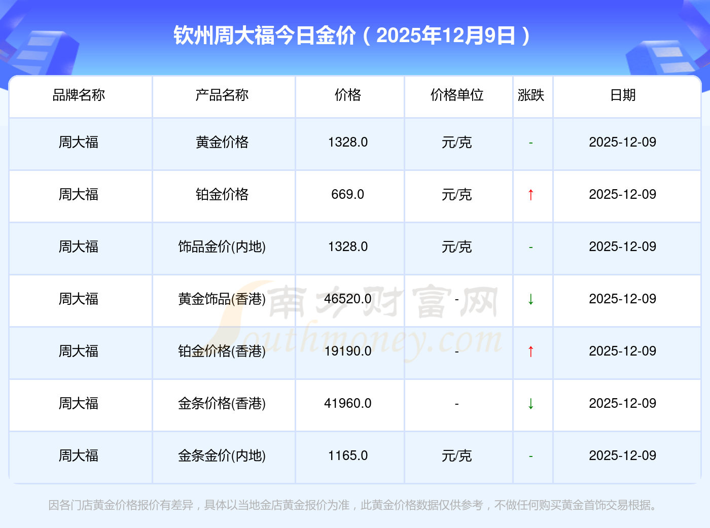 2025年12月9日欽州周大福今日價格:黃金價格1328.0元/克,鉑金價格669.0元/克,飾品金價(內(nèi)地)1328.0元/克,黃金飾品(香港)46520.0,鉑金價格(香港)19190.0,金條價格(香港)41960.0,金條金價(內(nèi)地)1165.0元/克,黃金價格1289.0元/克,鉑金價格613.0元/克,PT999鉑金價格613.0元/克,金條價格1184.0元/克。
