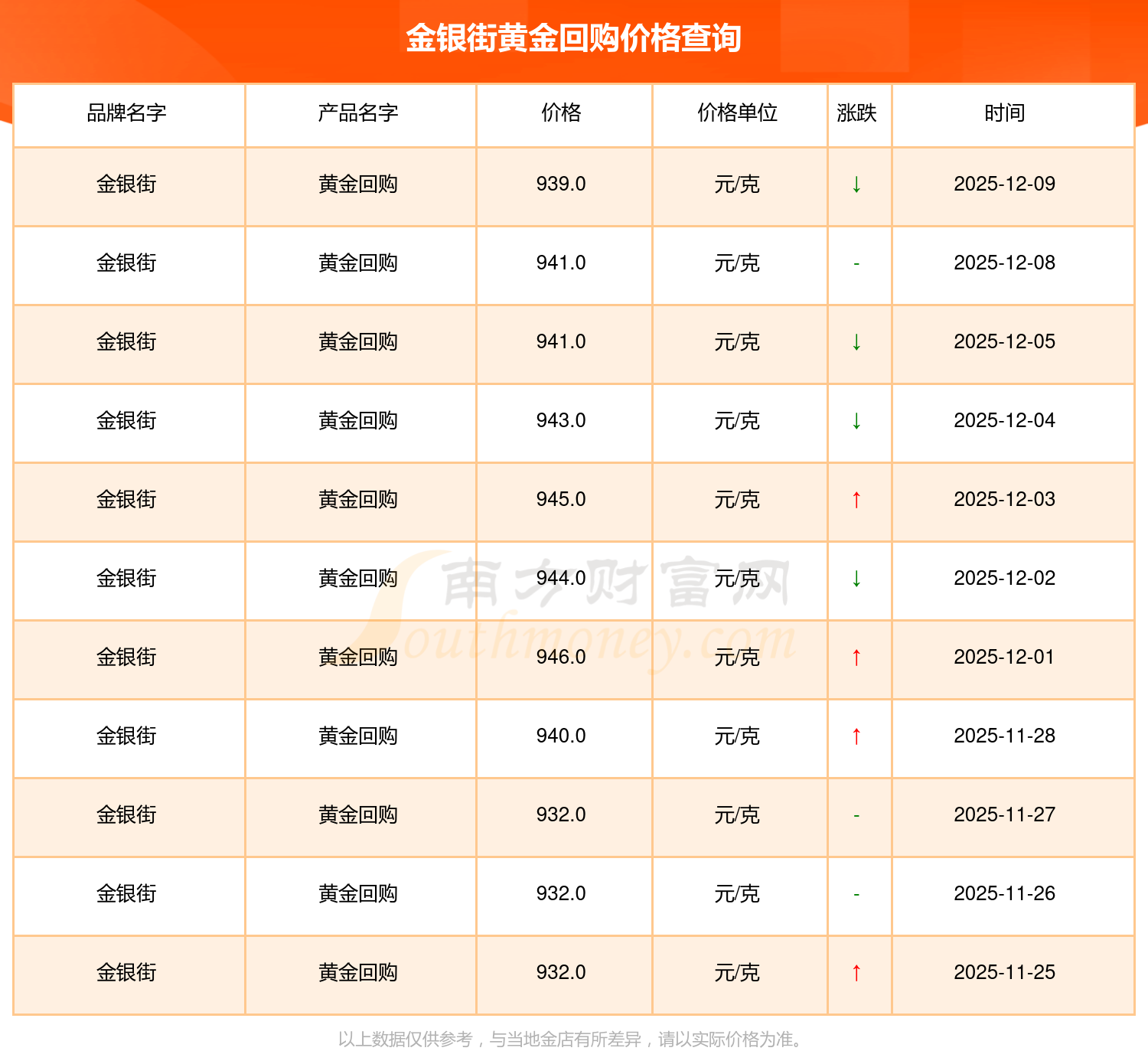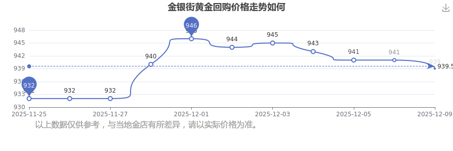 2025年12月9日金銀街黃金回購價格為939.0元/克。