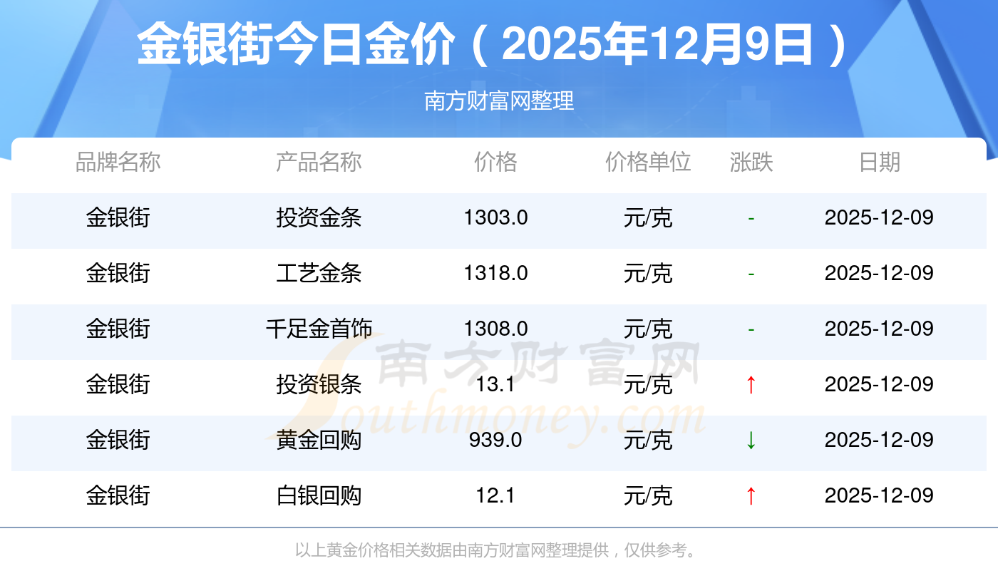 現(xiàn)在金銀街黃金價(jià)格是多少錢1克_2025年金銀街今日金價(jià)是多少錢一克,最新金銀街查詢,2025年12月9日金銀街工藝金條現(xiàn)在每克多少錢?最新金銀街工藝金條報(bào)價(jià)公布,一起來看看吧!