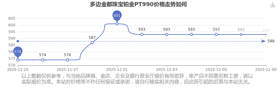 多邊金都珠寶 鉑金PT990今日最新的價(jià)位是593.0元/克。