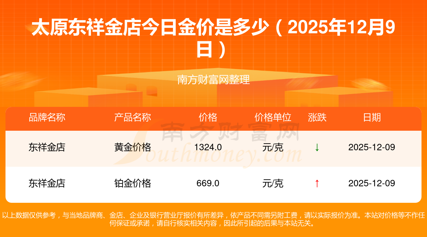 今天黃金價(jià)格是多少?現(xiàn)在黃金一克的價(jià)錢是怎樣的?2025年12月9日太原東祥金店今日價(jià)格:黃金價(jià)格1328.0元/克,鉑金價(jià)格669.0元/克,飾品金價(jià)(內(nèi)地)1328.0元/克,黃金飾品(香港)46520.0,鉑金價(jià)格(香港)19190.0,金條價(jià)格(香港)41960.0,金條金價(jià)(內(nèi)地)1165.0元/克,黃金價(jià)格1289.0元/克,鉑金價(jià)格613.0元/克,PT999鉑金價(jià)格613.0元/克,金條價(jià)格1184.0元/克。