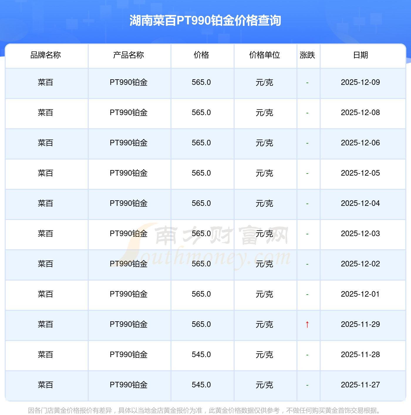 今日(2025年12月9日),565.0元/克是湖南菜百PT990鉑金的價(jià)格標(biāo)準(zhǔn)。