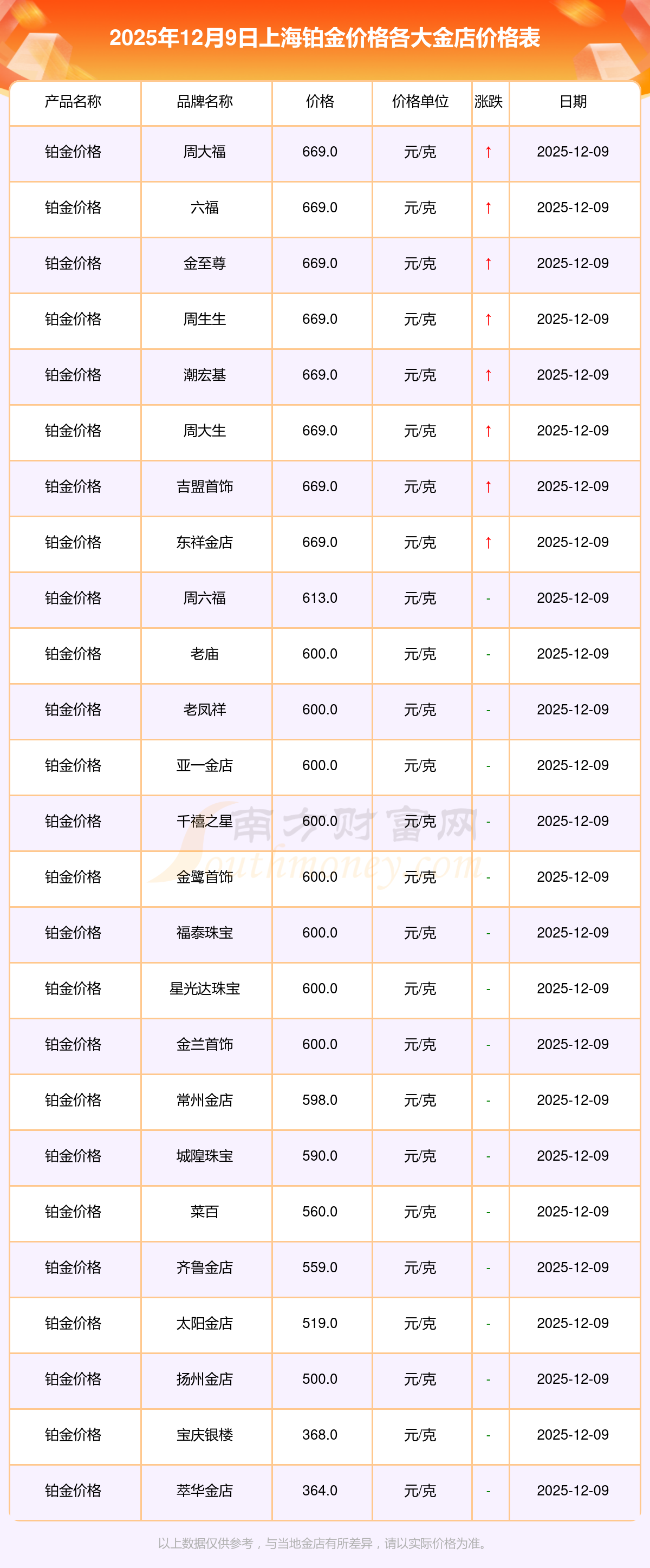 2025年12月9日上海周大福、周大福、周大福、周大福、周大福、周大福、周大福、周六福、周六福、周六福、周六福等各大金店品牌鉑金價格最新價格行情來了,如下:周大福黃金價格1328.0元/克,周大福鉑金價格669.0元/克,周大福飾品金價(內(nèi)地)1328.0元/克,周大福黃金飾品(香港)46520.0,周大福鉑金價格(香港)19190.0,周大福金條價格(香港)41960.0,周大福金條金價(內(nèi)地)1165.0元/克,周六福黃金價格1289.0元/克,周六福鉑金價格613.0元/克,周六福PT999鉑金價格613.0元/克,周六福金條價格1184.0元/克。