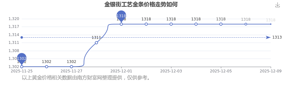 2025年12月9日金銀街工藝金條價格最新是1318.0元/克。