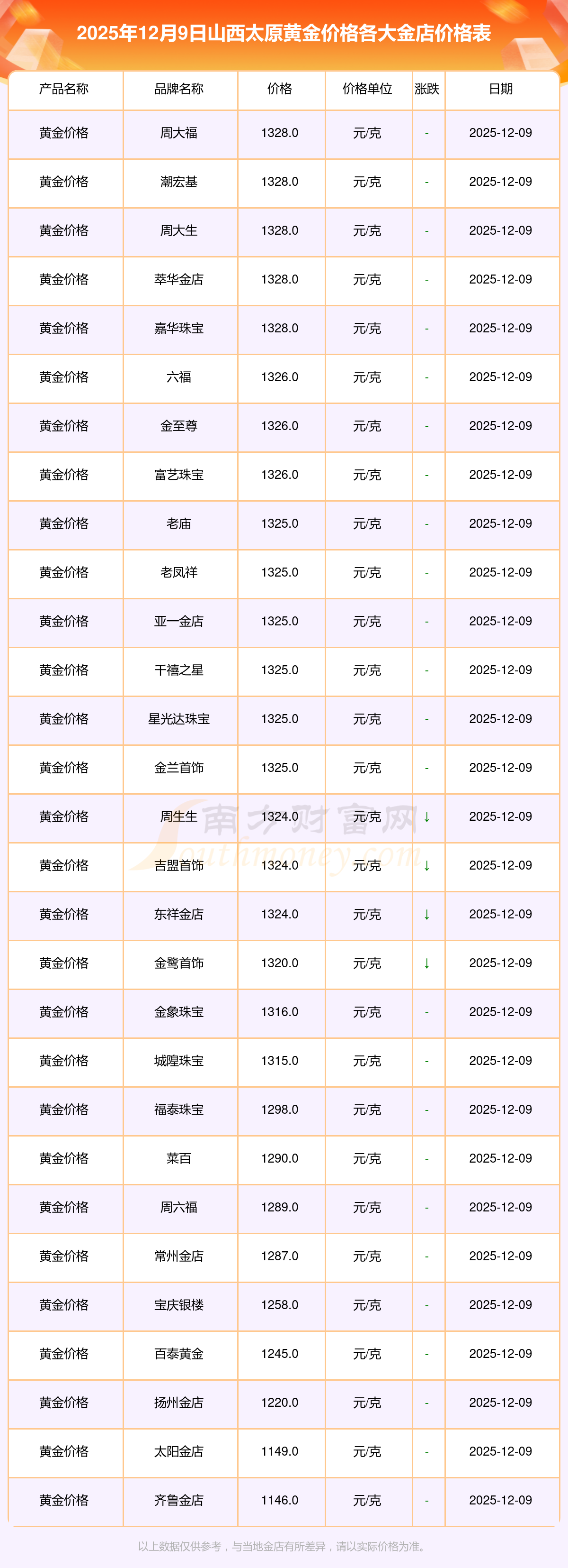 今天是2025年12月9日,山西太原周大福、周大福、周大福、周大福、周大福、周大福、周大福、周六福、周六福、周六福、周六福等各大金店品牌黃金價格最新價格如下:周大福1328.0元/克、周大福669.0元/克、周大福1328.0元/克、周大福46520.0、周大福19190.0、周大福41960.0、周大福1165.0元/克、周六福1289.0元/克、周六福613.0元/克、周六福613.0元/克、周六福1184.0元/克。